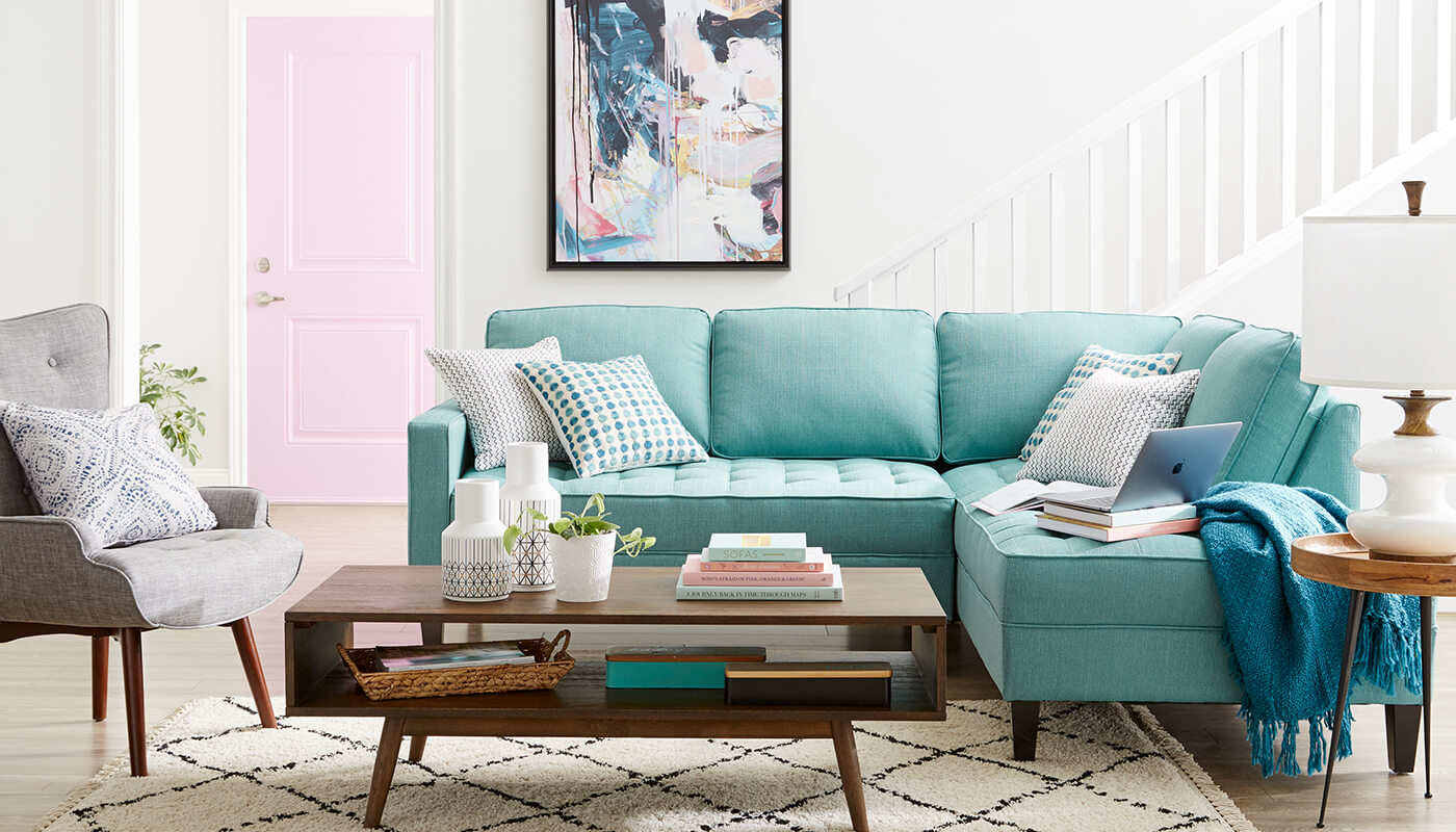 Start with a statement sofa. This robin’s egg blue sectional certainly does the trick! Let the furniture pop by layering neutral tones around it. Think: Natural wood, plus creams, greys and blacks.
