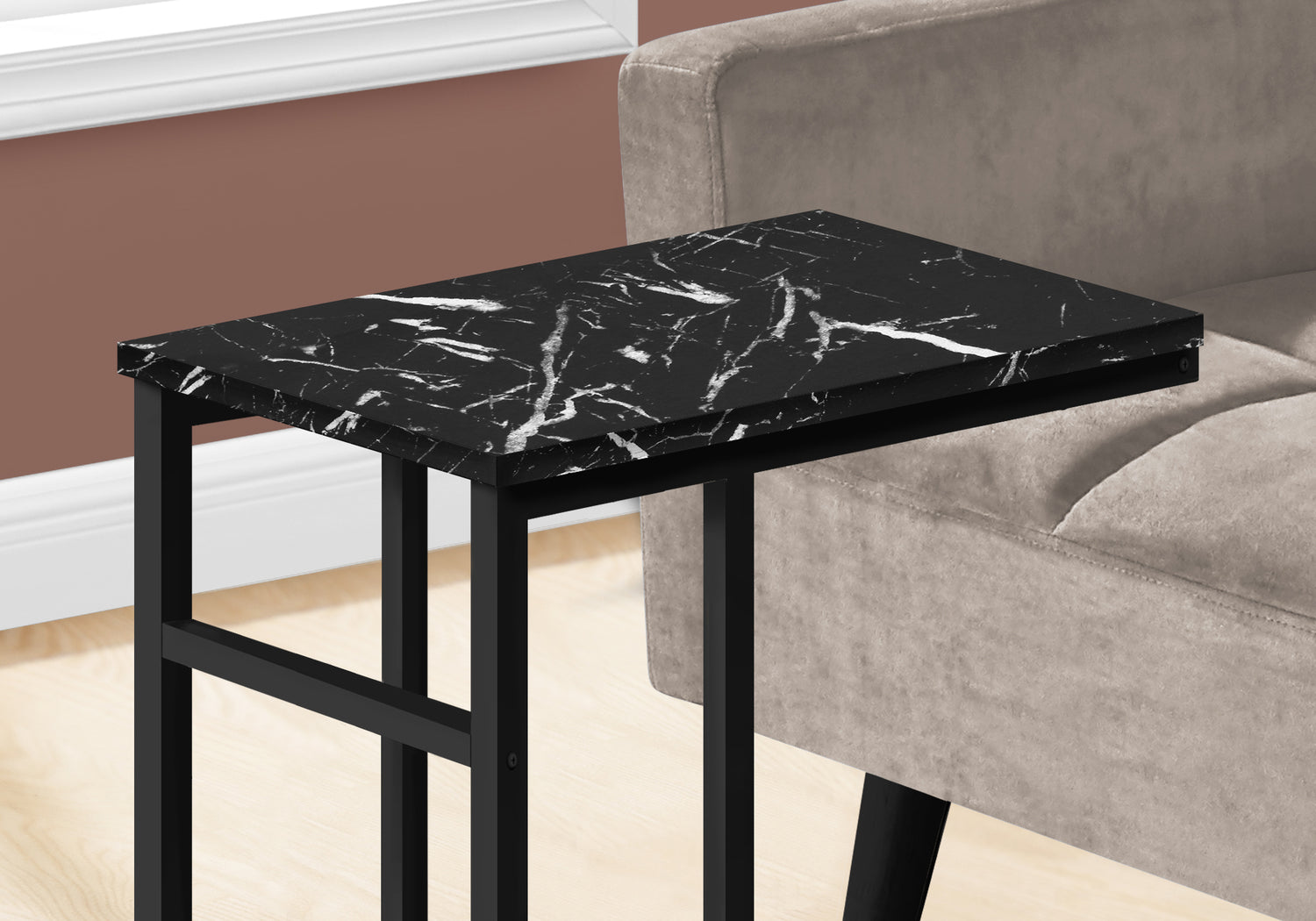 For a brilliant home upgrade, this faux Black Marble C shape side table does the trick. Supported by an elegant black metal base, the end table is made for anything from snacks and drinks to your laptop, tablet and even decorative accents that complement the rest of your décor. Bringing a modern touch to your small home, condo or apartment, this C table slides nicely under the couch or bed. Study session? Favorite movie? Quiet reading time? This side table handles all of the above.