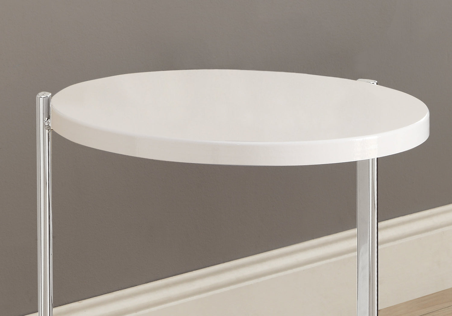 To have or not to have just isn't a question! This stylish glossy white round accent table offers a simple yet convenient place to put down your drinks, snacks, meals or even a tablet while lounging on your couch or entertaining. The sturdy yet fashionable chrome metal supports with an extra shelf at the bottom provide additional storage for this must-have table. Use this versatile contemporary snack and accent table for your living room, office space, family room or den.