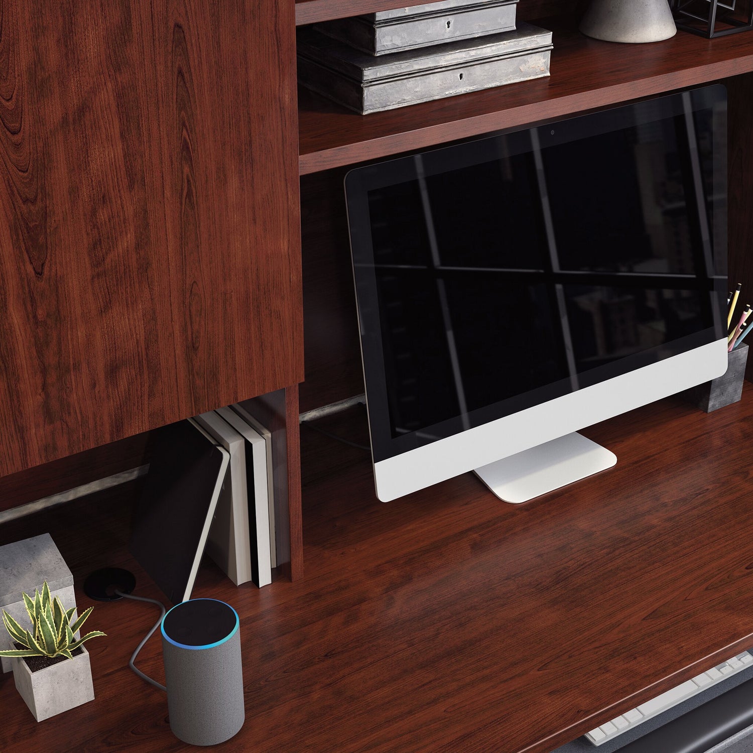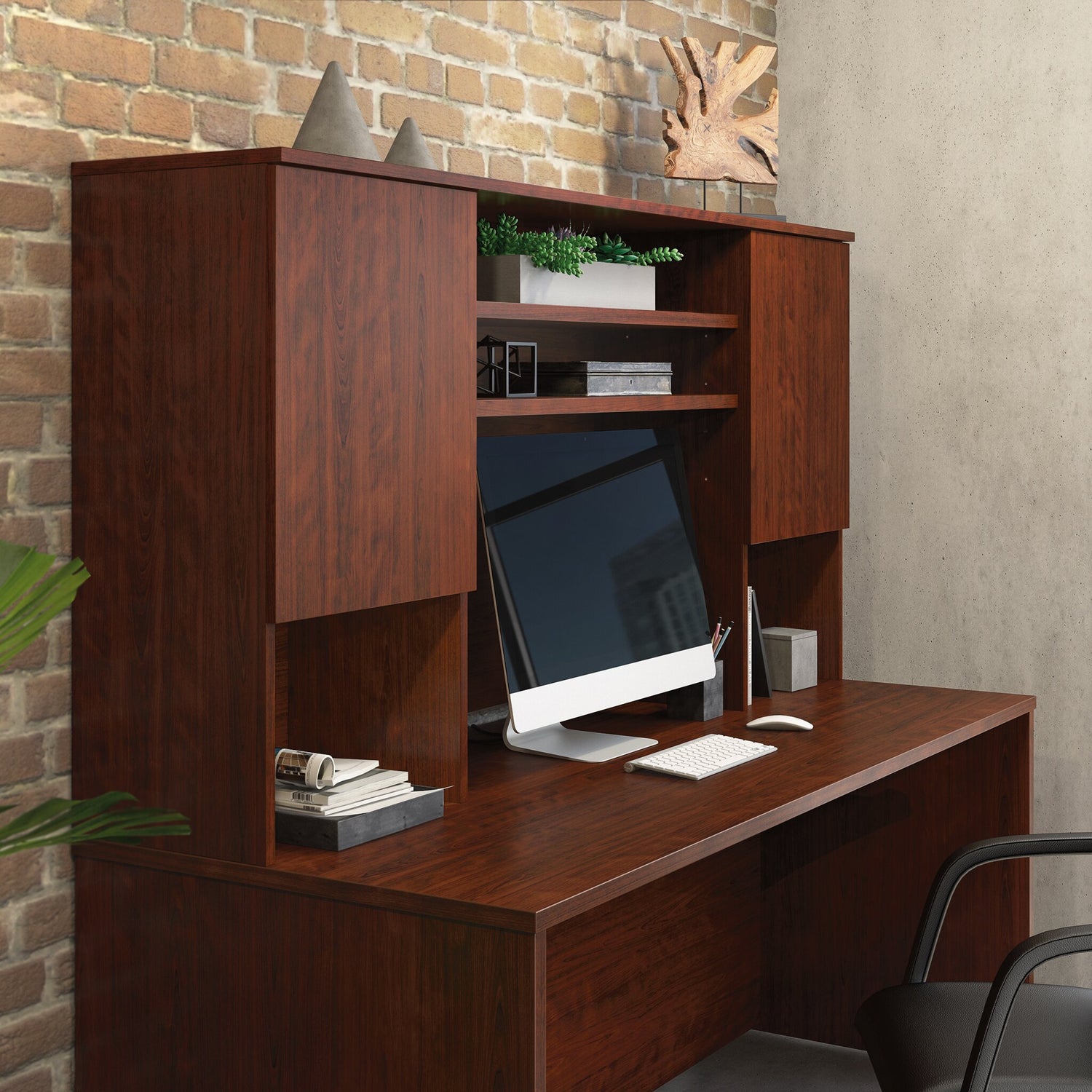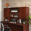Create a stunning focal point and increase the storage capabilities of your workspace with this Affirm 72" storage hutch. Nestled on the desktop, hutches add just the right amount of functionality to an office without taking up too much room. Keep those stacks of folders at bay thanks to convenient, hidden storage behind its cabinet doors. Meanwhile, two centre shelves allow for the display of decor items. Finished in cherry red, combine this office hutch with the compatible Affirm desks (AFFB2DSK, AFFB4DSK) for a stylish, first-rate workspace.