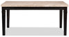 The table legs and apron are finished in a grey-brown stain, wire-brushed to lend a mature, rustic look to this piece. Like a salt-and-pepper hairstyle, the grey undertones help to soften the brown, adding a cheerful contrast to the beige marble.