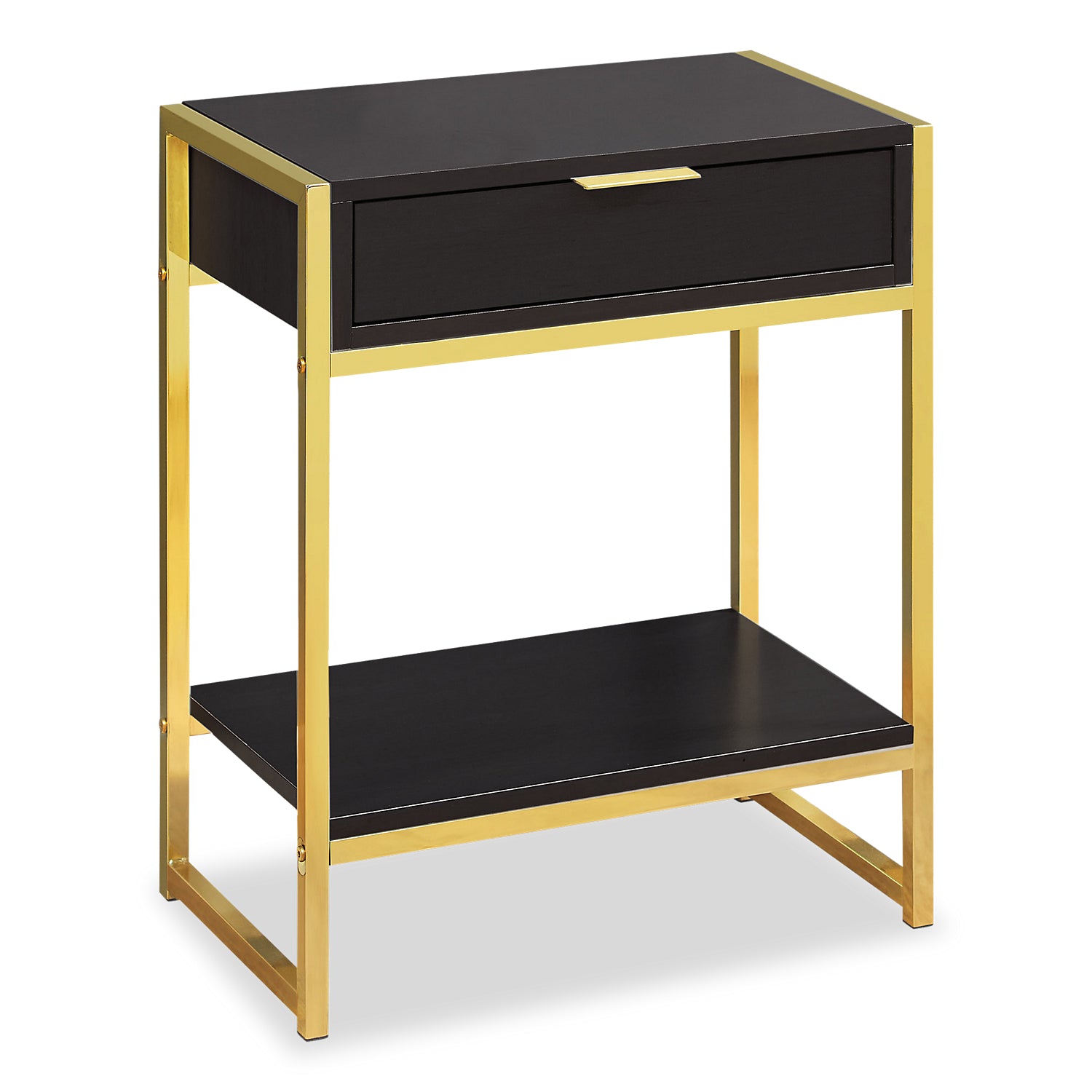 Add a dash of retro style to your home with the contemporary and multi-functional Alice accent table. The deep drawer and open bottom shelf are perfect to display your book collection and help keep mess under control. Simple, square metal leg supports and matching drawer pull bring vintage charm to this functional piece. Use this accent table in the bedroom as a chic nightstand or place it next to your modern upholstery as a sturdy side table – the smaller scale is perfect for many rooms and uses.