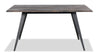 Gather your family around this rustic-modern Amos dining table. Lying on top of the wood tabletop is woodgrain-patterned paper laminate, creating an easy-to-maintain outdoorsy look. To take the natural feel even further, the live-edge look framing the surface features dips and points similar to those found on old barn boards. Grey metal legs splay out from the table's corners for durable support and contemporary style. Enjoy gathering your friends and family around this Amos table.