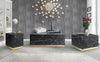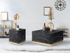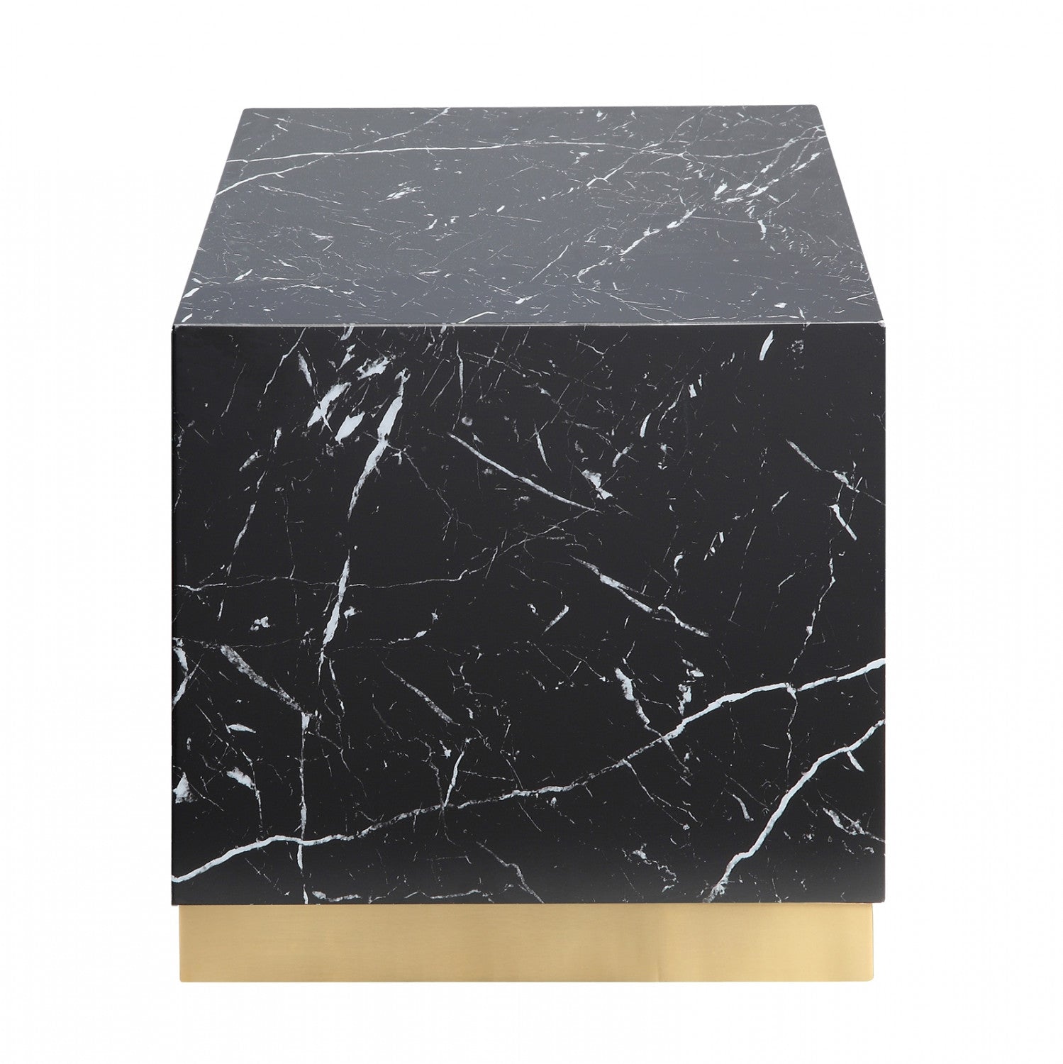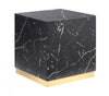Your living room is certain to stand out and delight guests with the addition of the alluring Aphrodite Occasional Collection. This eye-catching end table makes a bold statement thanks to its unique solid design and exquisite faux marble finish. Striking black is shot through with white veining, accented by the contrasting brushed gold finish of the metal base for an extra touch of glamour. A clear matte top coat adds a subtle luster and durability, protecting your table from stains and scratches and creating a surface that is easy to clean and maintain. Also available in white.