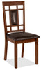 Sit at the table and enjoy the comfort of this dark Aran dining chair. Mango wood veneers cap the chair frame and deliver a contemporary ambiance, one which is enhanced by the dark walnut finish. Small carving details on the front legs add even more stylish touches beneath the glossy faux leather seat. Finally, cast your eyes on the beautiful backrest, a three-by-three grid with a matching faux leather accent. Whether you enjoy its comfort or its style, you'll surely be drawn to this fantastic chair.