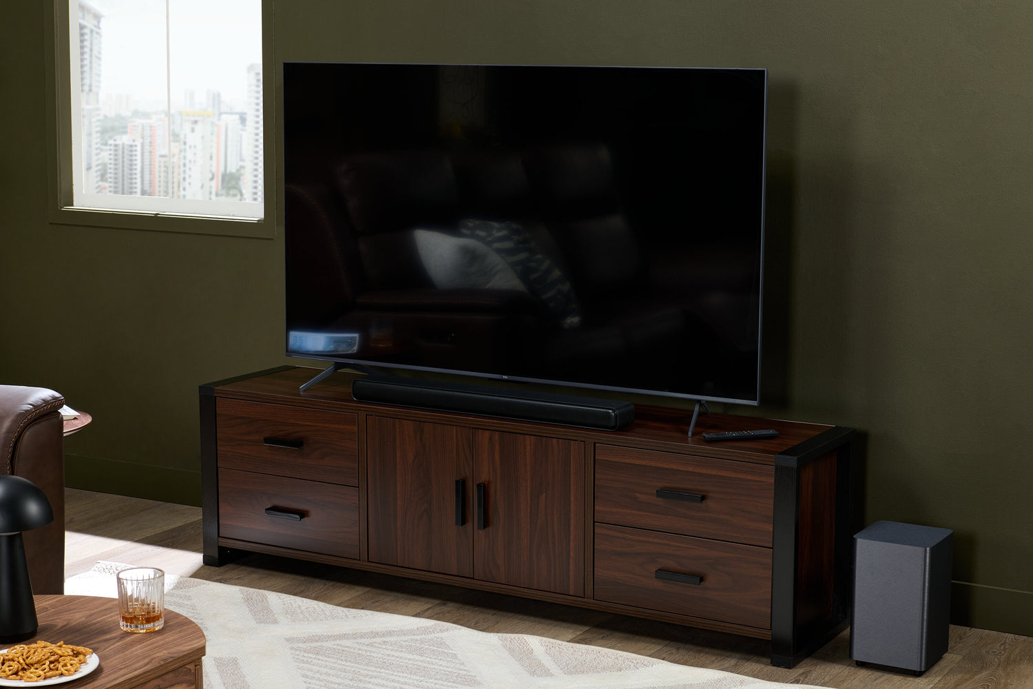 Make your home feel rustic chic with this Ashton TV stand. Espresso sides contrast against the dark walnut top and front for a beautiful and elegant entertainment piece. With four drawers, this stand has plenty of storage space for your movies and extra home theatre pieces. Behind the centre cabinet doors, use the shelf to set up your PVR and DVD player for a complete home theatre system.