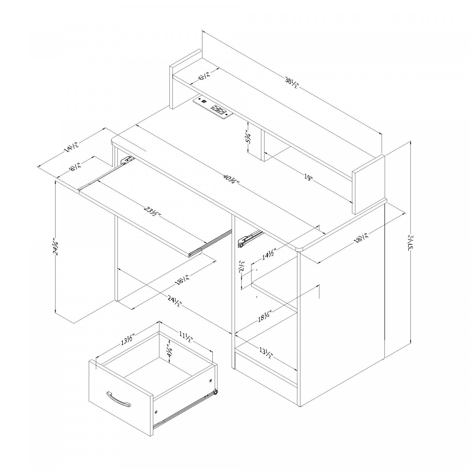 Need organization for your home office? This compact desk from the Axess collection offers a hutch two open storage spaces a drawer a keyboard tray and a surface ideal for your laptop. It also features a built-in power bar with 2 USB ports and 2 standard outlets. Perfect for easily charging and plugging in your devices.