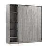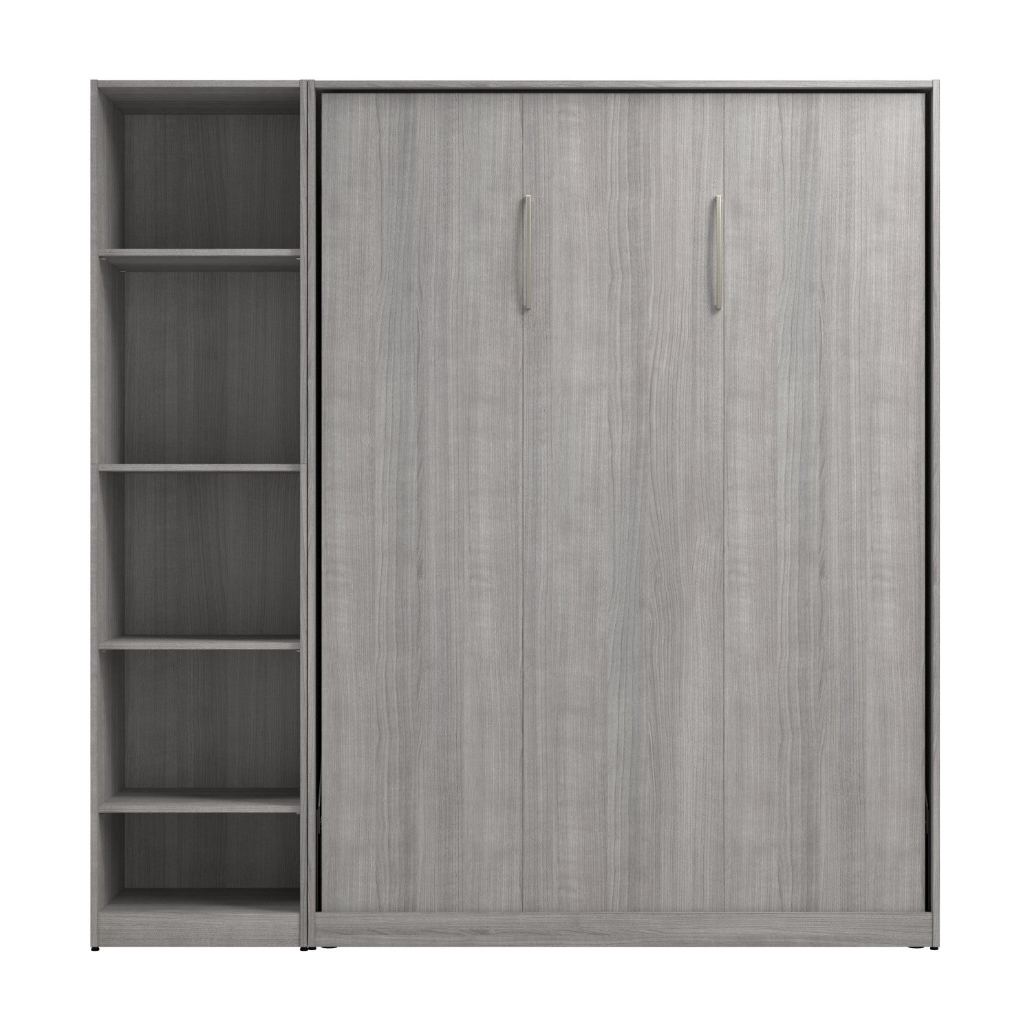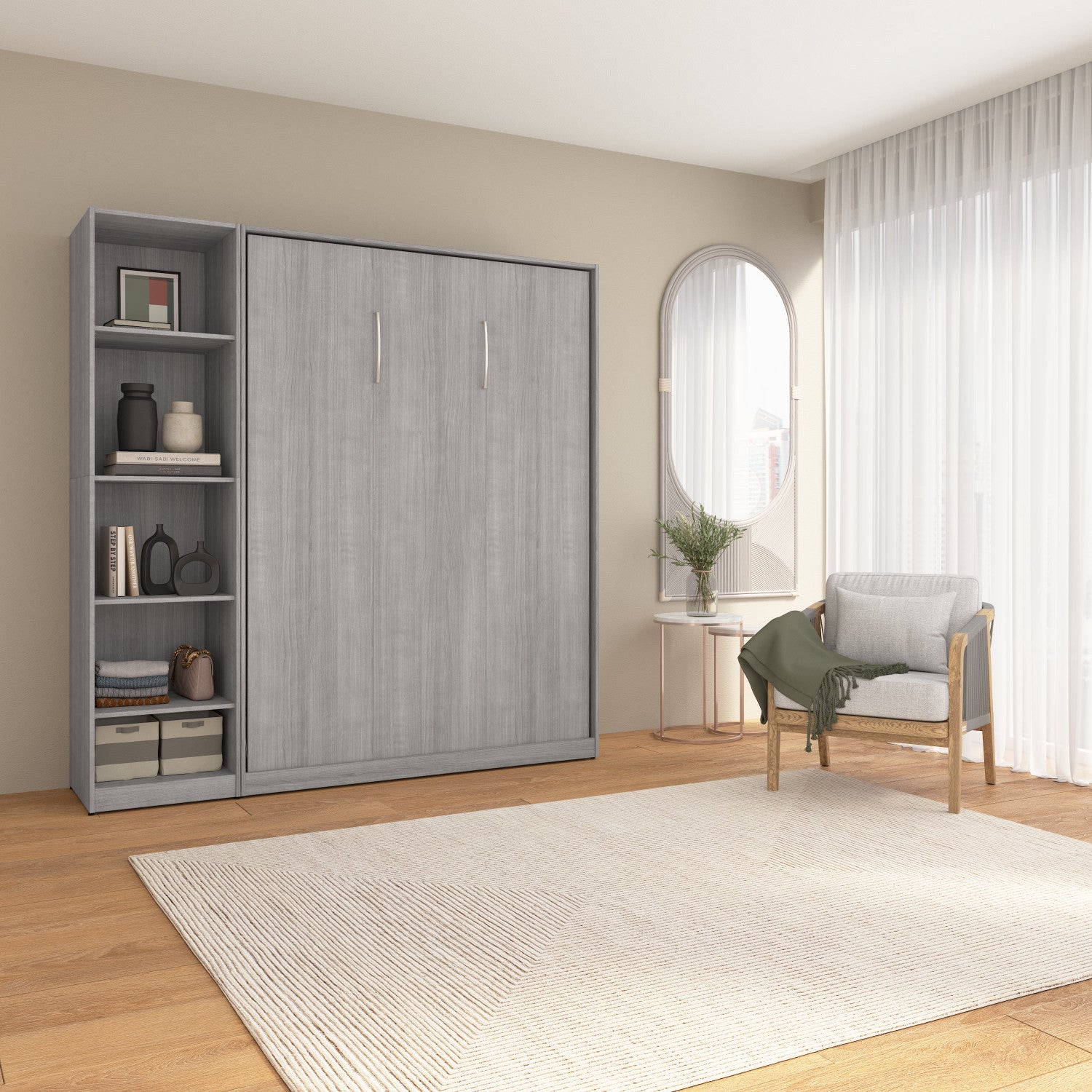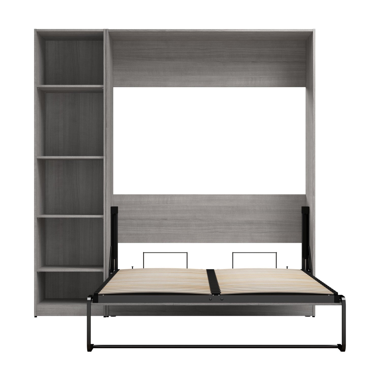 Blending affordability and style, the Bestar Claremont Full Murphy Bed with Closet Organizer (79W) is the perfect sleeping arrangement for any space. Dual pistons fold the Full Murphy bed down smoothly. The mattress support features flexible slats that absorb pressure for comfort. Wall bed accepts most full size mattresses. Take advantage of the closet organizer to store your items. The open bed extends 86.2 inches from the wall.