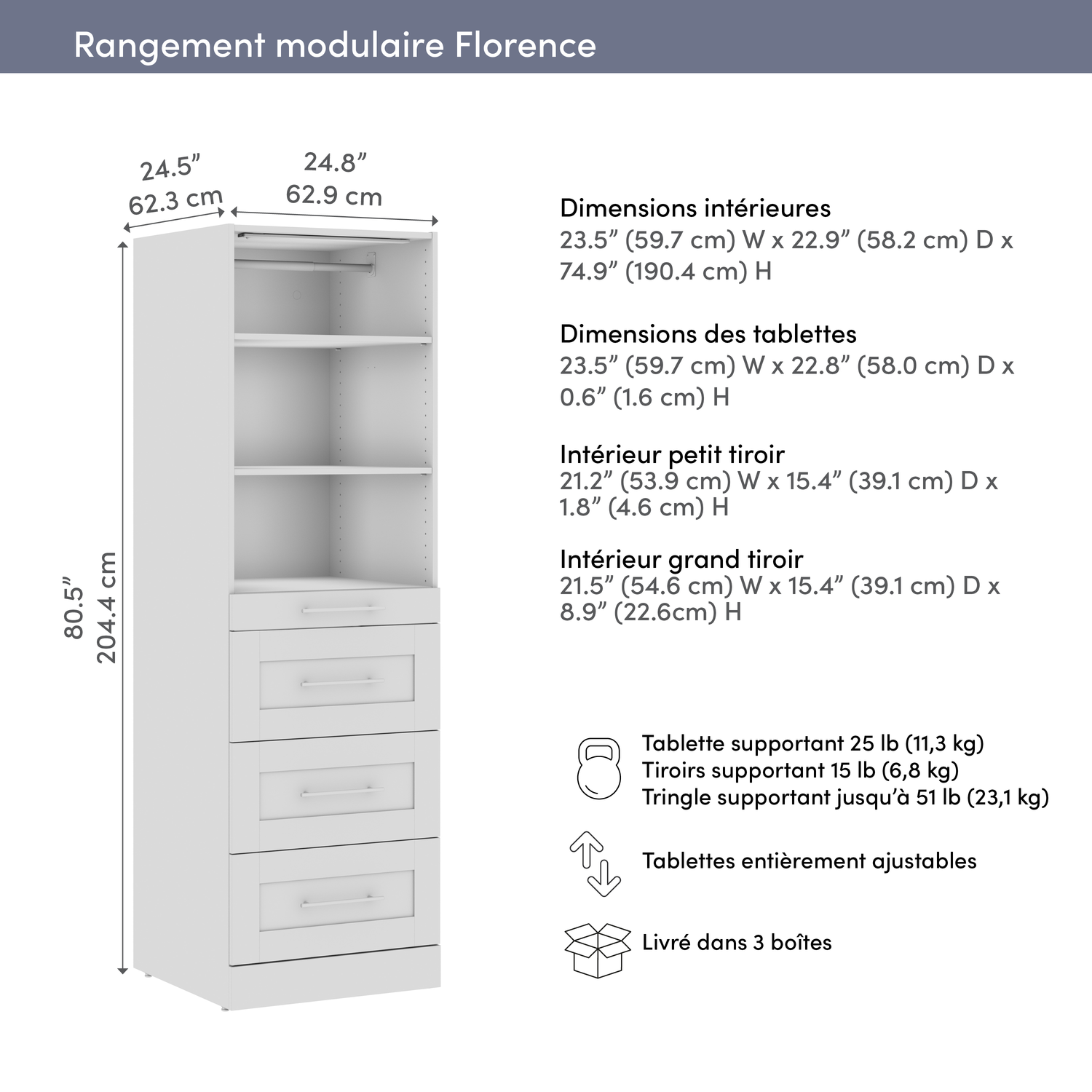 Enjoy the freedom to tailor your closet exactly as you envision it with the Bestar Florence 25W x 25D Modular Reach-In/Walk-In Closet System Tower with LED Light, Shelves and 4 Drawers Shaker Style. Imagine creating the space you want, right within the space you have. Space that keeps your belongings organized and easy to find — so your favourite sweater isn’t hiding, but right where you need it. With 5 adjustable shelves, 4 smooth-gliding and soft-closing drawers, and a removable clothing rod, you can arrange each element to fit your needs — whether you’re maximizing shelf space for folded essentials or adding hanging room for garments. It’s designed to help you add, swap and rearrange each component to stay ultra-organized as life unfolds. A rechargeable motion-sensing LED light illuminates your closet with ease, while the classic shaker trim and modern metal handles bring a stylish, personalized touch. Crafted from eco-conscious materials, this system embodies Bestar’s dedication to sustainability and quality.
