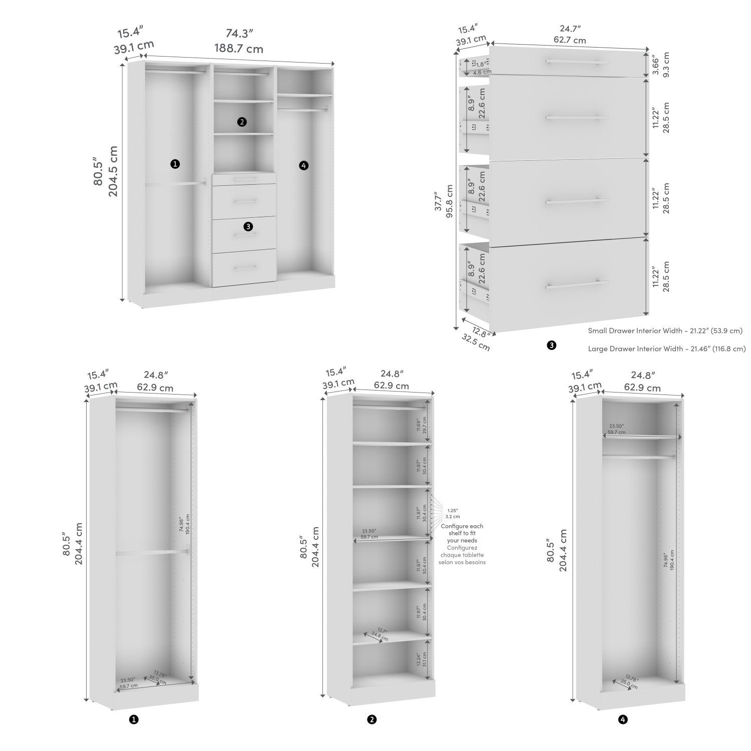 Enjoy the freedom to design your dream reach-in closet with the Bestar Florence Modular Reach-In Closet System with Rods, Shelves, and Drawers, Slab Style. Imagine creating the space you want, right within the space you have. Space that keeps your belongings organized and easy to find — so your favourite sweater isn’t hiding, but right where you need it. With 6 adjustable shelves, 4 smooth-gliding and soft-closing drawers, and 4 adjustable clothing rods, you can tailor your storage to fit your needs — whether you’re maximizing shelf space for folded essentials or adding hanging room for garments. It’s designed to help you add, swap, and rearrange each component to stay ultra-organized as life unfolds. The sleek slab drawer fronts and modern metal handles add a timeless, stylish touch to your closet. Crafted from eco-conscious materials, this system embodies Bestar’s dedication to sustainability and quality.