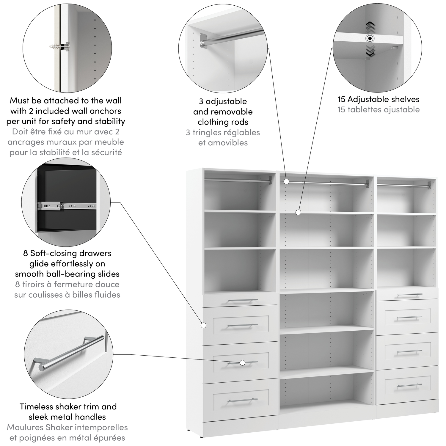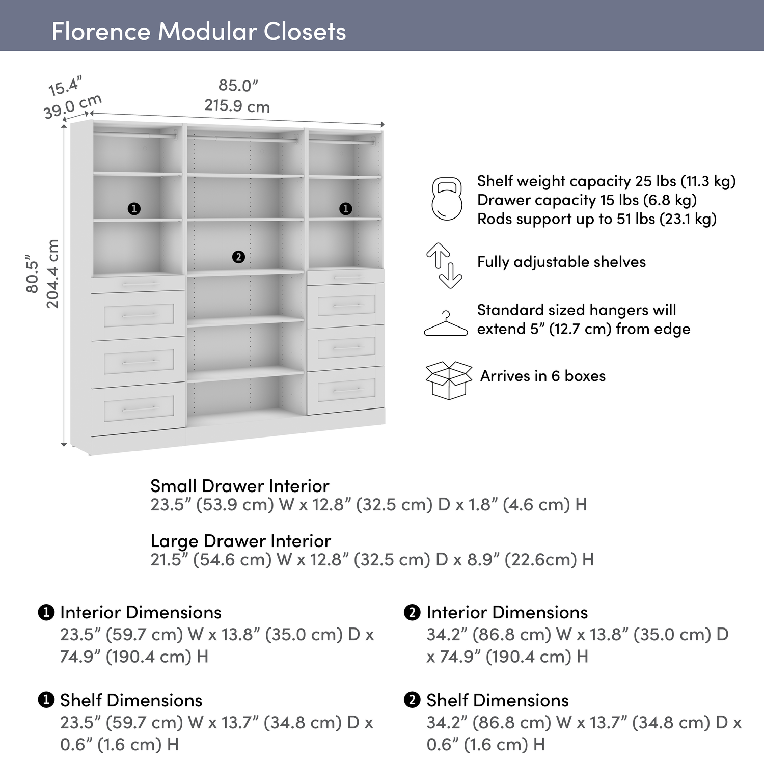 Enjoy the freedom to tailor your closet exactly as you envision it with the Bestar Florence 85W x 16D Modular Reach-In/Walk-In Closet System with Shelves and Drawers Shaker Style. Imagine creating the space you want, right within the space you have. Space that keeps your belongings organized and easy to find — so your favourite sweater isn’t hiding, but right where you need it. With 15 adjustable shelves, 8 smooth-gliding and soft-closing drawers and 3 removable clothing rods, you can arrange each element to fit your needs — whether you’re maximizing shelf space for folded essentials or adding hanging room for garments. It’s designed to help you add, swap and rearrange each component to stay ultra-organized as life unfolds. The classic shaker trim and modern metal handles add a timeless, stylish touch to your closet. Crafted from eco-conscious materials, this system embodies Bestar’s dedication to sustainability and quality.