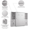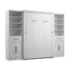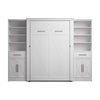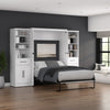 The Bestar Key West Full Murphy Bed and Closet Organizers with Doors and Drawers (113W) is the ideal space saver for a multipurpose room. Unique X pattern accents paired with Antique Bronze hardware create a relaxed and airy style that works well with coastal and farmhouse decor. The Full Murphy bed folds up and down smoothly and quickly thanks to the dual piston system. Choose your own mattress since the bed accommodates most standard Full mattresses (8-10 inches thick, 60-90 lb, 54 x 75 inches) and supports up to 1000 lb (including mattress). The open bed extends 88.2 inches from the wall. Allow a clearance of 30-36 inches around the open bed. The dual-mount wall bed mechanism attaches to the floor and wall for ease of assembly and maximum stability and durability. Each tall cabinet features 2 fixed and 4 adjustable shelves as well as 1 drawer and 2 doors. To avoid risk of injury, the Murphy bed must be installed to wall and floor structure by a professional or qualified person. Two people are required for assembly. Installation requires attachment to wood studs or masonry, removal of the baseboard, and drilling into the floor (if disassembly is required, holes may be covered with baseboards 0.5 inches or thicker). All necessary hardware is included. The cabinet must be anchored to a wall with a minimum ceiling height of 87 inches. Do not use this product for children or pets under 50 pounds (22.7 kg). The Murphy Bed is backed by the Bestar 10 Year Manufacturer’s Warranty.