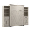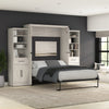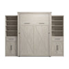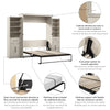 The Bestar Key West Queen Murphy Bed and Closet Organizers with Doors and Drawers (119W) is the ideal space saver for a multipurpose room. Unique X pattern accents paired with Antique Bronze hardware create a relaxed and airy style that works well with coastal and farmhouse decor. The Queen Murphy bed folds up and down smoothly thanks to the dual piston system. Choose your own mattress since the bed accommodates most standard Queen mattresses (8-12 inches thick, 60-90 lb, 60 x 80 inches) and supports up to 1000 lb (including mattress). The open bed extends 92.9 inches from the wall. Allow a clearance of 30-36 inches around the open bed. The dual-mount wall bed mechanism attaches to the floor and wall for ease of assembly and maximum stability and durability. Each tall cabinet features 2 fixed and 4 adjustable shelves as well as 1 drawer and 2 doors. To avoid risk of injury, the Murphy bed must be installed to wall and floor structure by a professional or qualified person. Two people are required for assembly. Installation requires attachment to wood studs or masonry, removal of the baseboard, and drilling into the floor (if disassembly is required, holes may be covered with baseboards 0.5 inches or thicker). All necessary hardware is included. The cabinet must be anchored to a wall with a minimum ceiling height of 92.1 inches. Do not use this product for children or pets under 50 pounds (22.7 kg). The Murphy Bed is backed by the Bestar 10 Year Manufacturer’s Warranty.