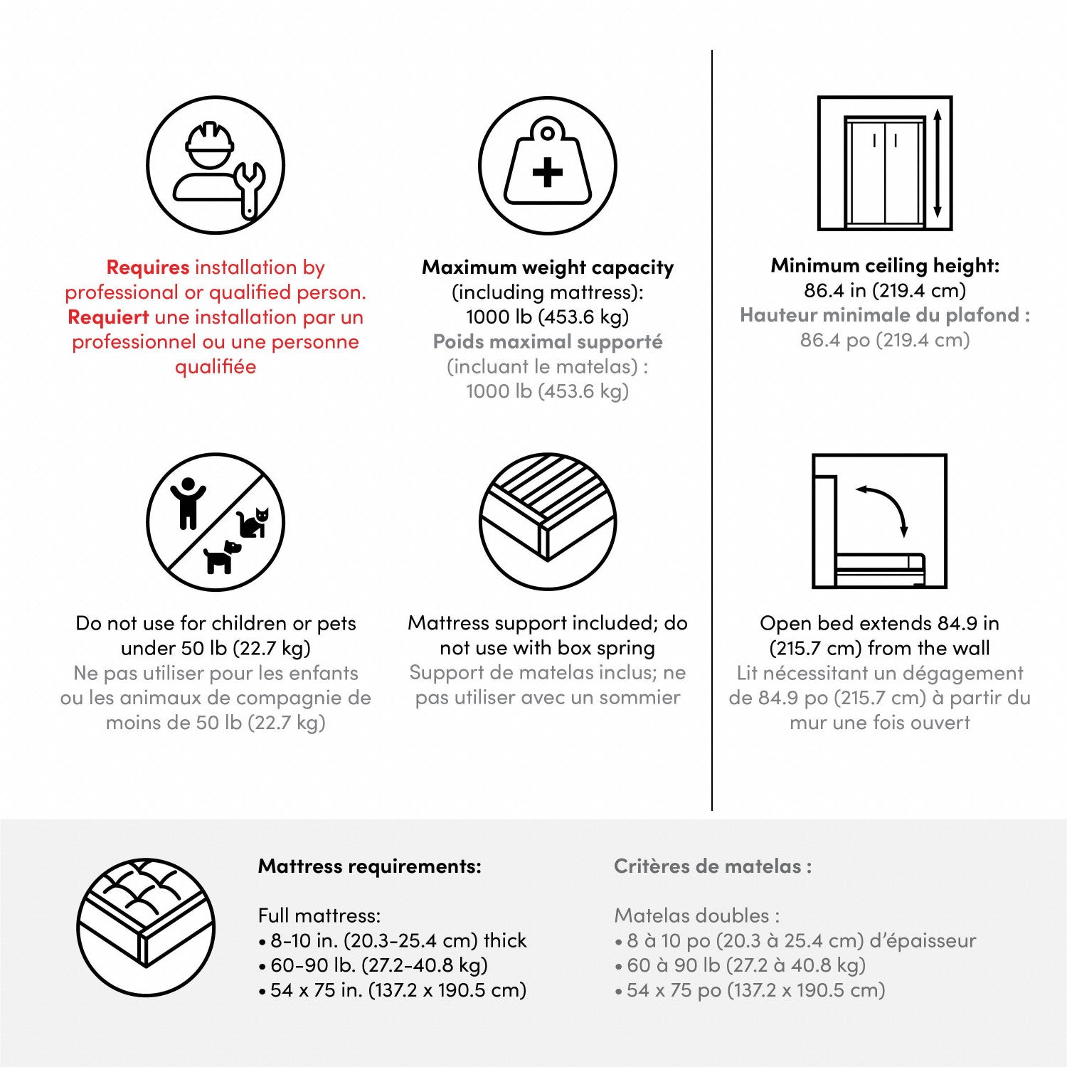 The Bestar Pur 59W Full Murphy Bed is the ideal space saver for a multipurpose room. Easily transform your home gym or office into a guest room. The mattress support uses flexible slats that follow the curves of the body and absorb pressure for maximum comfort. The Full Murphy bed can be used every night for a good night’s sleep. The bed folds up and down smoothly and quickly thanks to the dual piston system. Choose your own mattress since the bed accommodates most standard Full mattresses (8-10 inches thick, 60-90 lb, 54 x 75 inches) and supports up to 1000 lb (including mattress). The open bed extends 84.9 inches from the wall. The cabinet must be anchored to a wall with a minimum ceiling height of 86.4 inches. Allow a clearance of 30-36 inches around the open bed. The dual-mount wall bed mechanism attaches to the floor and wall for maximum stability and durability. To avoid risk of injury, the Murphy bed must be installed to the wall and floor structure by a professional or qualified person. Two people are required for assembly. Installation requires attachment to wood studs or masonry, removal of the baseboard, and drilling into the floor (if disassembly is required, holes may be covered with baseboards 0.5 inches or thicker). All necessary hardware is included. Do not use this product for children or pets under 50 pounds (22.7 kg). The Murphy Bed is backed by the Bestar 10 Year Manufacturer’s Warranty. North American made with globally sourced materials.