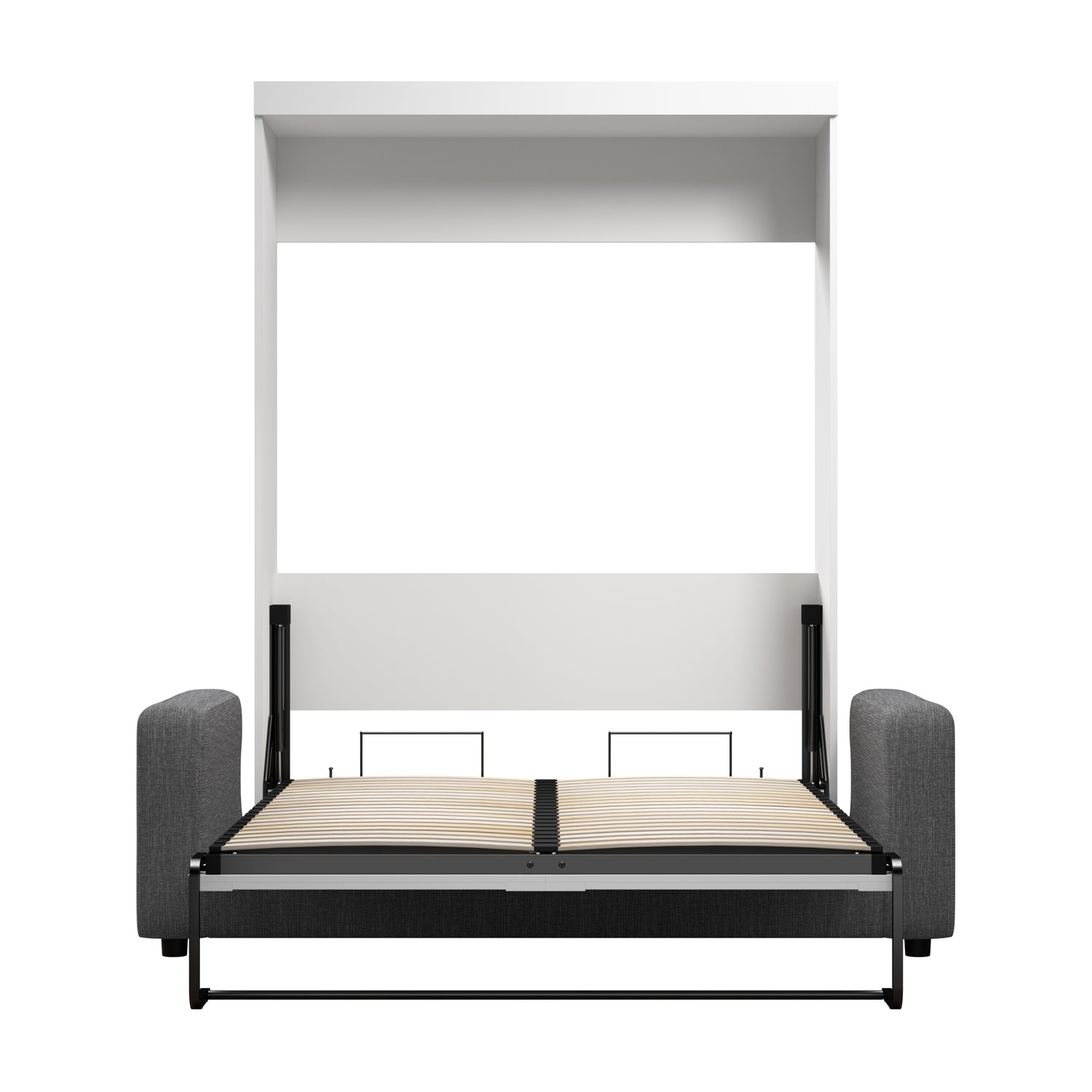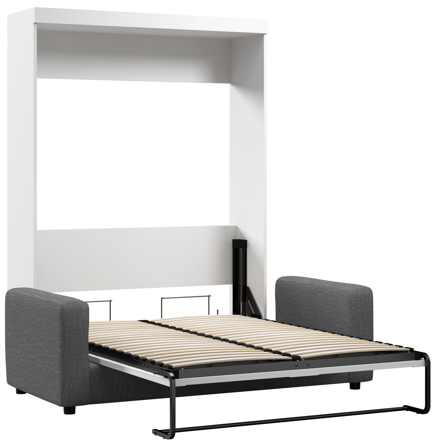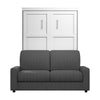 The Bestar Pur Full Murphy Bed with Sofa (73W) is perfect for a multipurpose room. It offers a comfortable place to sit as well as a place to sleep. The shaker-inspired trim and metal handles offer a transitional style that complements your decor. Make the most out of your space with this convenient piece of furniture. Sit comfortably during the day and simply remove the cushions and fold out the wall bed to sleep at night. The mattress support uses flexible slats that follow the curves of the body and absorb pressure for maximum comfort. The bed accommodates most standard Full mattresses. The cabinet must be anchored to a wall with a minimum ceiling height of 86. 4 inches. The open bed extends 84. 9 inches from the wall. The dual-mount wall bed mechanism attaches to the floor and wall for ease of assembly and maximum stability and durability. To avoid risk of injury, the bed must be installed to wall and floor structure by a professional or qualified person. Two people are required for assembly. Installation requires attachment to wood studs or masonry, removal of the baseboard, and drilling into the floor (if disassembly is required, holes may be covered with baseboards 0. 5 inches or thicker). All necessary hardware is included. Do not use this product for children or pets under 50 pounds (22. 7 kg). This Full Murphy bed is backed by the Bestar 10 Year Manufacturer’s Warranty, the sofa is warranted 1 year. North American made with globally sourced materials.