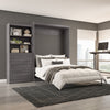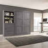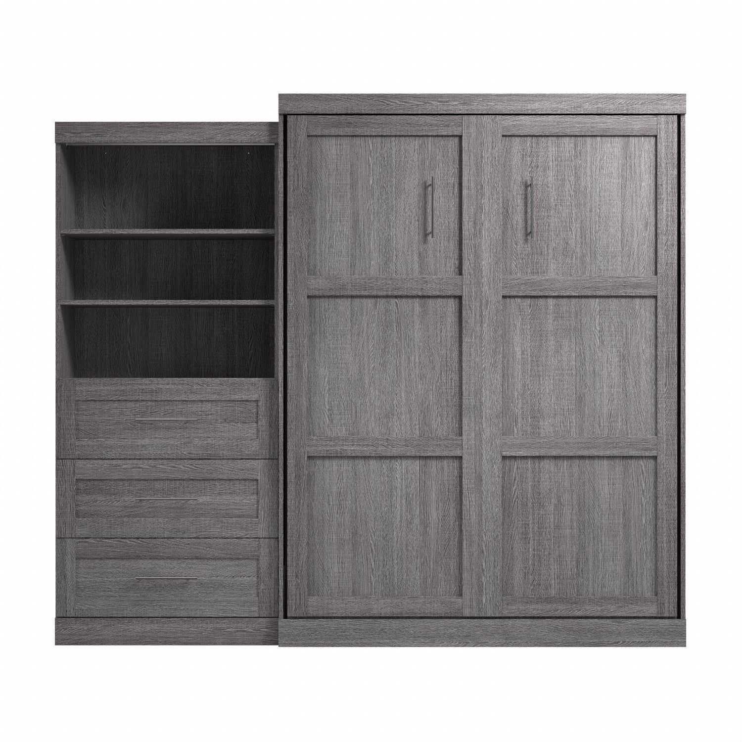 The Bestar Pur Queen Murphy Bed and Shelving Unit with Drawers (101W) is the ideal space saver. The mattress support uses flexible slats that follow the curves of the body and absorb pressure for maximum comfort. The Queen Murphy bed can be used every night for a good night’s sleep. It folds up and down smoothly thanks to the dual piston system. The bed accommodates most standard Queen mattresses (8-12 inches thick, 60-90 lb, 60 x 80 inches) and supports up to 1000 lb. The open bed extends 92 inches from the wall. The cabinet must be anchored to a wall with a minimum ceiling height of 91. 1 inches. Allow a clearance of 30-36 inches around the open bed. The shelving unit comes with 2 fixed and 3 adjustable shelves, 2 closet rods, and 3 drawers for your belongings. The dual-mount wall bed mechanism attaches to the floor and wall for ease of assembly and maximum stability and durability. To avoid risk of injury, the Murphy bed must be installed to wall and floor structure by a professional or qualified person. Two people are required for assembly. Installation requires attachment to wood studs or masonry, removal of the baseboard, and drilling into the floor (if disassembly is required, holes may be covered with baseboards 0. 5 inches or thicker). Necessary hardware is included. Do not use this product for children or pets under 50 pounds (22. 7 kg). The set is backed by the Bestar 10 Year Manufacturer’s Warranty. North American made with globally sourced materials.