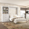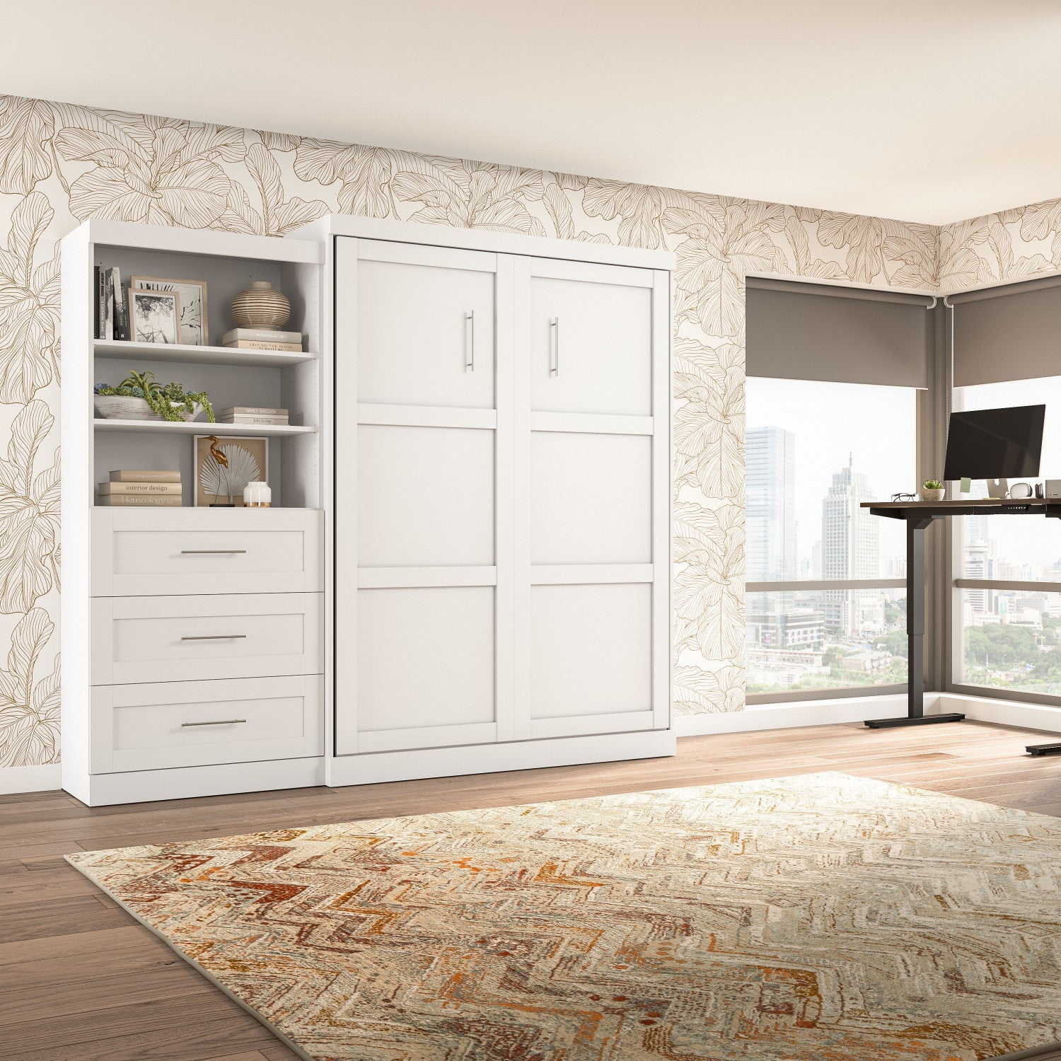 The Bestar Pur Queen Murphy Bed and Shelving Unit with Drawers (101W) is the ideal space saver. The mattress support uses flexible slats that follow the curves of the body and absorb pressure for maximum comfort. The Queen Murphy bed can be used every night for a good night’s sleep. It folds up and down smoothly thanks to the dual piston system. The bed accommodates most standard Queen mattresses (8-12 inches thick, 60-90 lb, 60 x 80 inches) and supports up to 1000 lb. The open bed extends 92 inches from the wall. The cabinet must be anchored to a wall with a minimum ceiling height of 91. 1 inches. Allow a clearance of 30-36 inches around the open bed. The shelving unit comes with 2 fixed and 3 adjustable shelves, 2 closet rods, and 3 drawers for your belongings. The dual-mount wall bed mechanism attaches to the floor and wall for ease of assembly and maximum stability and durability. To avoid risk of injury, the Murphy bed must be installed to wall and floor structure by a professional or qualified person. Two people are required for assembly. Installation requires attachment to wood studs or masonry, removal of the baseboard, and drilling into the floor (if disassembly is required, holes may be covered with baseboards 0. 5 inches or thicker). Necessary hardware is included. Do not use this product for children or pets under 50 pounds (22. 7 kg). The set is backed by the Bestar 10 Year Manufacturer’s Warranty. North American made with globally sourced materials.