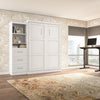 The Bestar Pur Queen Murphy Bed and Shelving Unit with Drawers (90W) is the ideal space saver. The mattress support uses flexible slats that follow the curves of the body and absorb pressure. The Queen Murphy bed can be used every night for a good night’s sleep. The bed folds up and down smoothly thanks to the dual piston system. The wall bed accommodates most standard Queen mattresses (8-12 inches thick, 60-90 lb, 60 x 80 inches) and supports up to 1000 lb (including mattress). The open bed extends 92 inches from the wall. The cabinet must be anchored to a wall with a minimum ceiling height of 91. 1 inches. Allow a clearance of 30-36 inches around the open bed. The shelving unit comes with 2 fixed and 3 adjustable shelves, and 3 drawers to hold your belongings. The dual-mount wall bed mechanism attaches to the floor and wall for ease of assembly and maximum stability and durability. To avoid risk of injury, the Murphy bed must be installed to wall and floor structure by a professional or qualified person. Two people are required for assembly. Installation requires attachment to wood studs or masonry, removal of the baseboard, and drilling into the floor (if disassembly is required, holes may be covered with baseboards 0. 5 inches or thicker). All necessary hardware is included. Do not use this product for children or pets under 50 pounds (22. 7 kg). This bedroom set is backed by the Bestar 10 Year Manufacturer’s Warranty. North American made with globally sourced materials.
