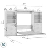 Thanks to this beautiful Bestar Pur Queen Murphy Bed and 2 Shelving Units with Drawers (136W), you can create a multipurpose room anywhere in your home. The comfortable Queen Murphy bed can be slept on every night and folds up and down smoothly. The shelving units offer a combination of open and closed storage to meet all your needs. The mattress support uses flexible slats that follow the curves of the body and absorb pressure for maximum comfort. You can choose your own mattress since the bed accommodates most standard Queen mattresses and supports up to 1000 lb (including mattress). The open bed extends 92 inches from the wall. Allow a clearance of 30-36 inches around the open bed. The cabinet must be anchored to a wall with a minimum ceiling height of 91. 1 inches. The dual-mount wall bed mechanism attaches to the floor and wall for ease of assembly and maximum stability and durability. To avoid risk of injury, the Murphy bed must be installed to wall and floor structure by a professional or qualified person. Two people are required for assembly. Installation requires attachment to wood studs or masonry, removal of the baseboard, and drilling into the floor (if disassembly is required, holes may be covered with baseboards 0. 5 inches or thicker). All necessary hardware is included. Do not use this product for children or pets under 50 pounds (22. 7 kg). Backed by the Bestar 10 Year Manufacturer’s Warranty. North American made with globally sourced materials.