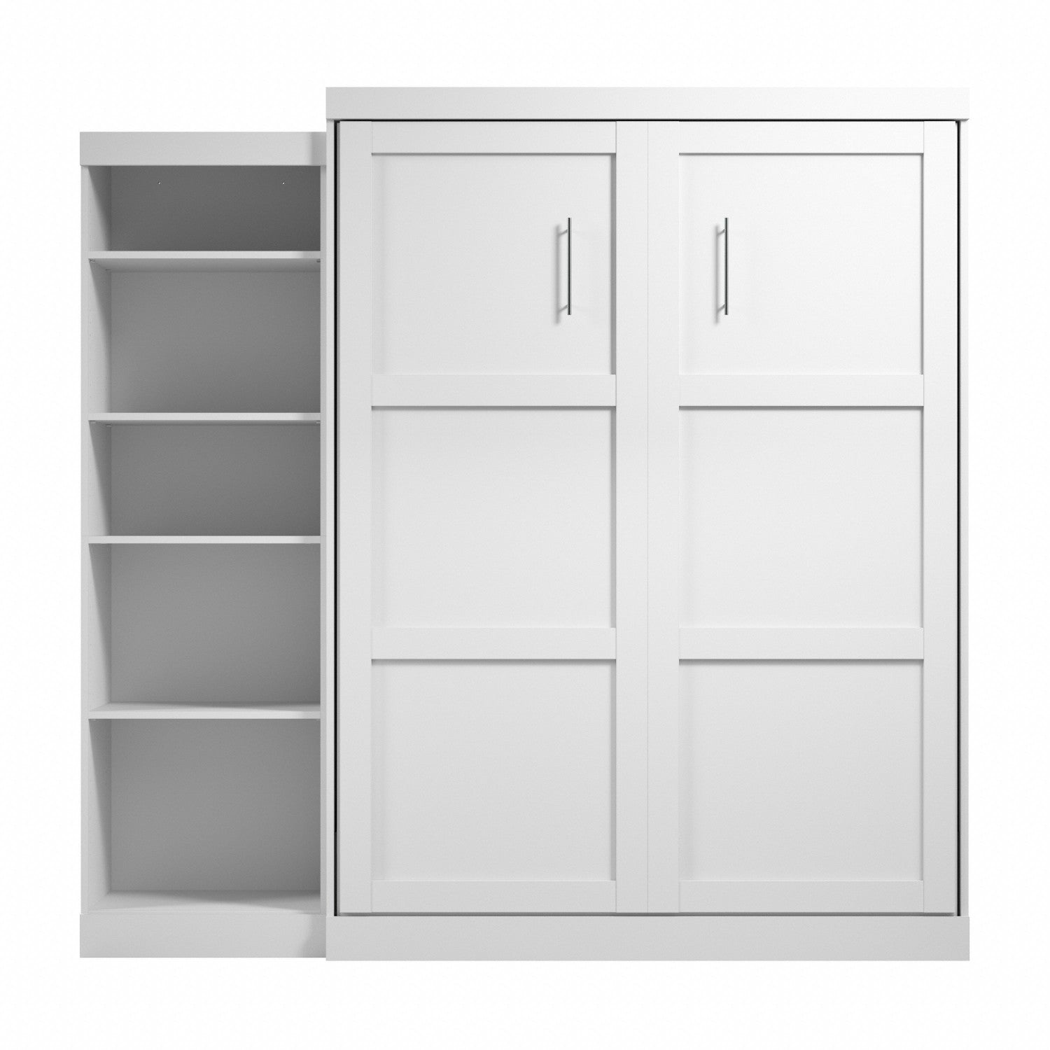 The Bestar Pur Queen Murphy Bed with Shelving Unit (90W) is the ideal space saver for a multipurpose room. The mattress support uses flexible slats that follow the curves of the body and absorb pressure for maximum comfort. The Queen Murphy bed can be used every night for a good night’s sleep. The bed folds up and down smoothly thanks to the dual piston system. The wall bed accommodates most standard Queen mattresses (8-12 inches thick, 60-90 lb, 60 x 80 inches) and supports up to 1000 lb (including mattress). The open bed extends 92 inches from the wall. The cabinet must be anchored to a wall with a minimum ceiling height of 91. 1 inches. Allow a clearance of 30-36 inches around the open bed. The shelving unit comes with 2 fixed and 3 adjustable shelves to hold your personal items. The dual-mount wall bed mechanism attaches to the floor and wall for maximum stability and durability. To avoid risk of injury, the Murphy bed must be installed to wall and floor structure by a professional or qualified person. Two people are required for assembly. Installation requires attachment to wood studs or masonry, removal of the baseboard, and drilling into the floor (if disassembly is required, holes may be covered with baseboards 0. 5 inches or thicker). All necessary hardware is included. Do not use this product for children or pets under 50 pounds (22. 7 kg). This bundle is backed by the Bestar 10 Year Manufacturer’s Warranty. North American made with globally sourced materials.