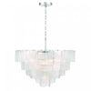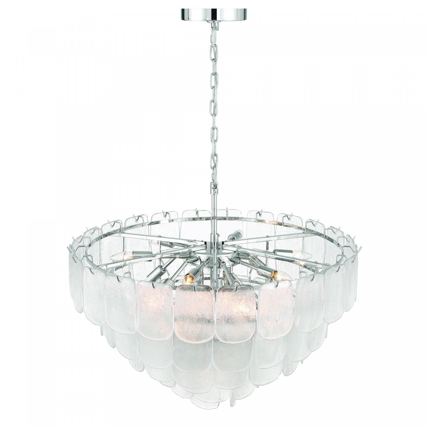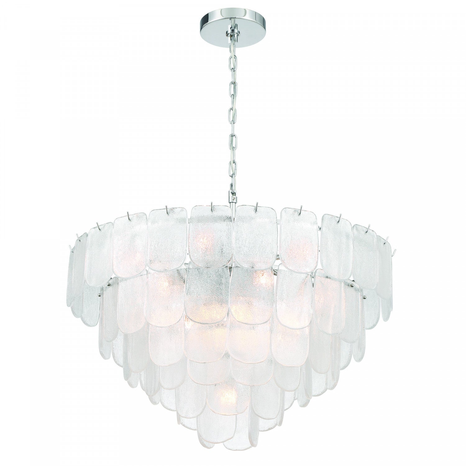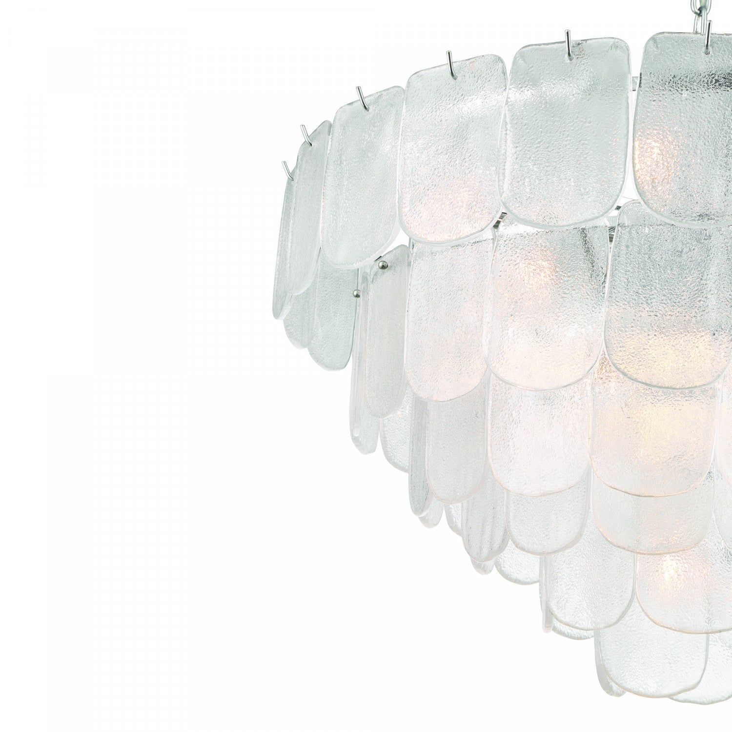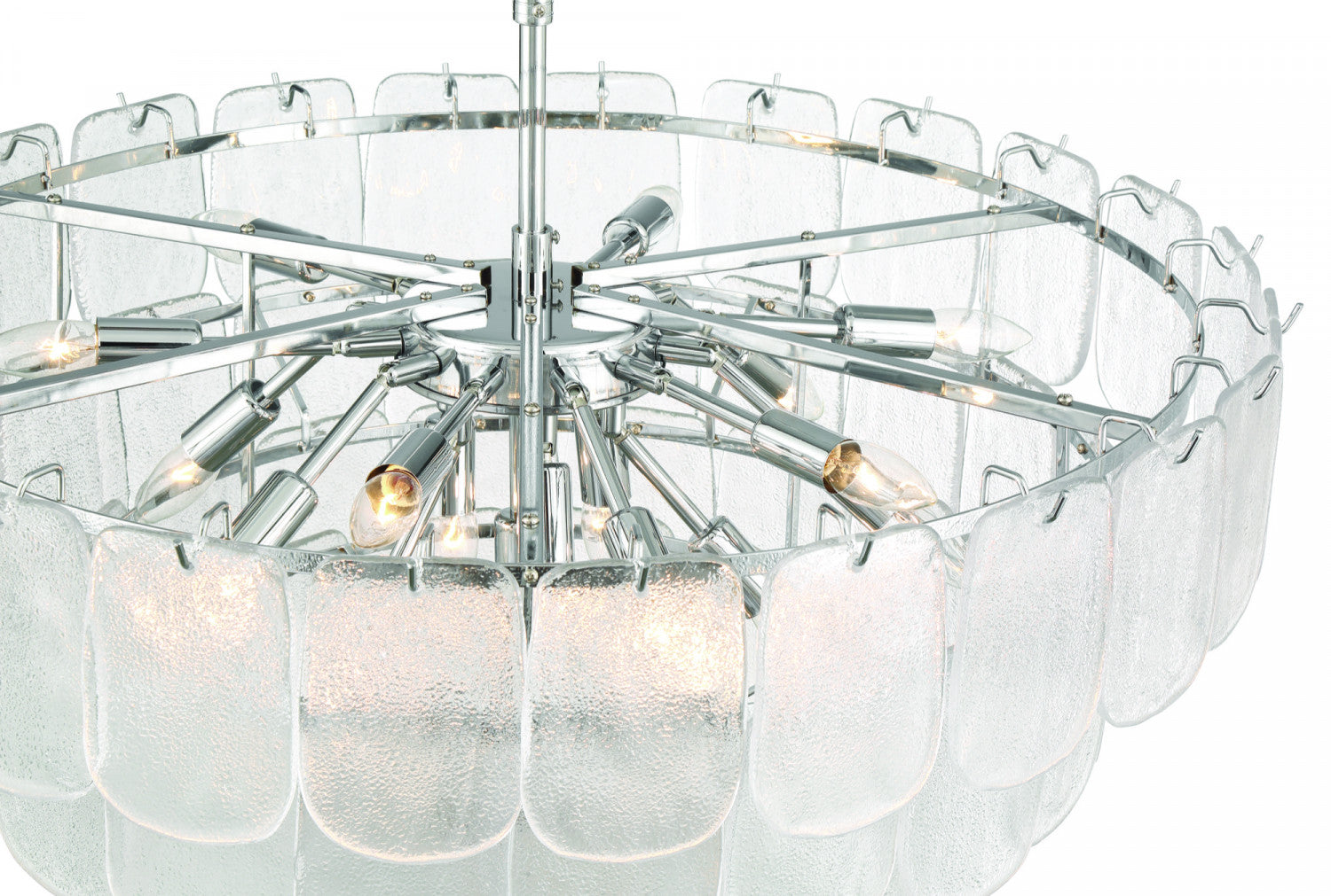 The chandelier from the bianca collection exudes elegance with its cascading clear “piastra” glass panels that shimmer like delicate ice sculptures. These textured glass elements are gracefully suspended from a polished nickel frame, radiating a sense of refined artistry and grace. (large size version shown)