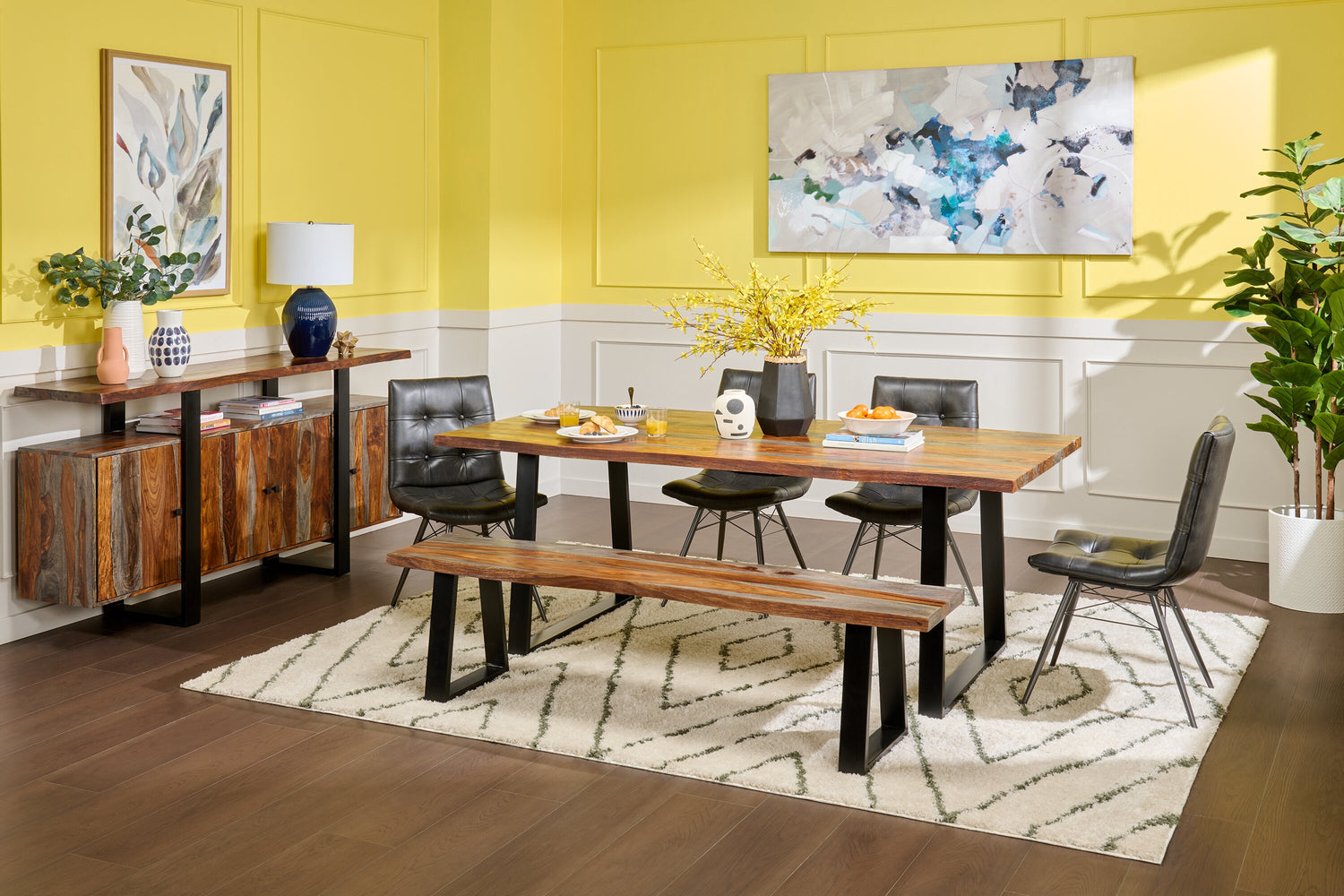 Inspire your home with rustic character with this Bowery dining bench. Like fine dining, the beauty of this design is all in the details. Up top, a solid plank of sheesham wood makes up the entire seat surface – no veneers, just polished wood. The live edges and grey undertones serve as stylish sidekicks to the dramatic woodgrain. And below, while most staple-shaped bases stick to rigid right angles, the trapezoid legs take this piece from stare-worthy to stunning.