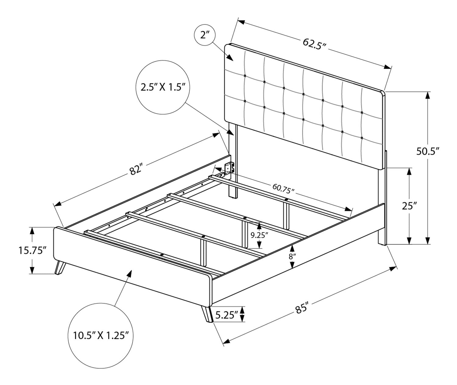 | Other Dimensions | Internal Bed Frame Dimension (D x W, inches): 82 x 60.75 |