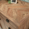 Storage space is a must in any modern home office – and this Cannery Bridge office credenza is just what you need. A decorative herringbone pattern adds style to a functional top surface with room for books, a lamp or other decor. The top drawer can be used as a traditional pencil drawer or a place for your laptop or keyboard by flipping the front down. Behind the door is a shelf that can be adjusted to your needs, while the two file drawers easily hold your most important letter-size hanging files. Finished in a natural tone, this beautiful cabinet gives your office space a luminous, modern vibe.