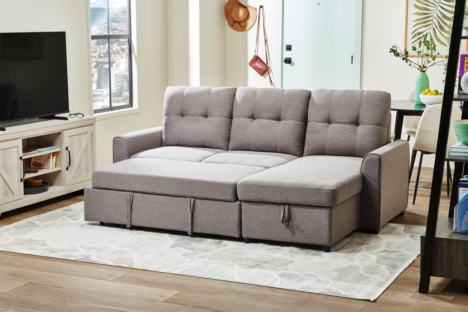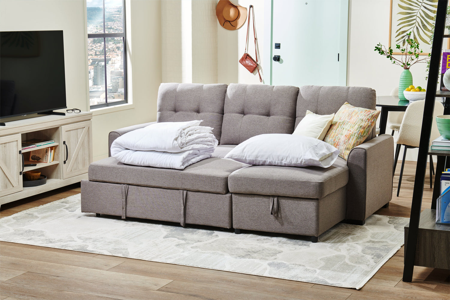 | Storage Options | Lift the chaise cushion to store blankets, pillows and other bedtime necessities for this sleeper sectional. |