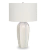 Bring some contemporary sophistication to any room with this stylish 27"h table lamp. A beautiful blend of art-deco with a modern edge, the smooth cream ceramic base in a tapered vase shape, is complimented with an elegant ivory linen drum shade and finished with a silver metal finial on top. With a 3-way switch that houses a single bulb (not included) for a maximum output of 100W/120V, this lamp offers three levels of illuminating light for creating the ambiance you desire. Attached with a 5ft transparent cord, this is the perfect functional accent to place on an end or side table in a living room or home office or bring it into your bedroom to set on a nightstand or bedside table. Made with high-quality materials, this lamp includes a 2-year limited warranty against any manufacturer's defects for a worry-free purchase.