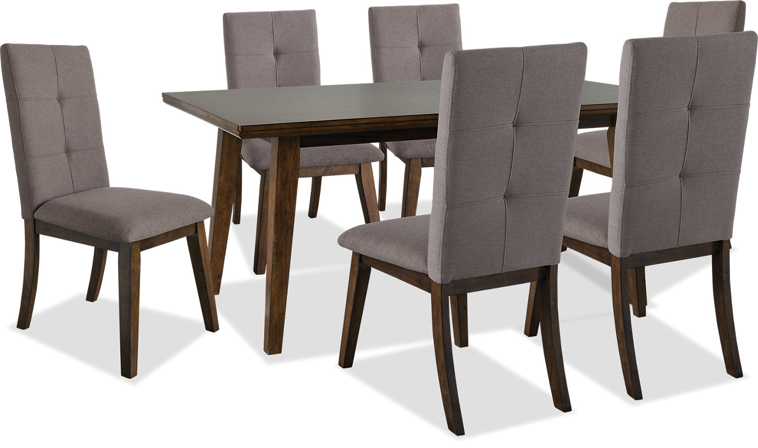 Turn an everyday meal into a lasting memory with this Chelsea seven-piece dining package. Simple and sturdy, the rectangular table allows you and five of your closest companions to break bread in style. The rubberwood table is capped with Mindi veneers, known for their elaborate grain patterns and ability to hold stain well. In this case, that natural beauty is emphasized by a walnut finish. Meanwhile, six overstuffed brown chairs make taking a seat at this table a lasting treat.