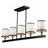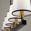 From the S&C design firm, with strict direction from Steven Sabados, the Coco Collection of island light features a transitional frame which has flat type arms. The frame is finished in a rich matte black, and has harvest brass accents. The hardback white linen shades are complimented with upper and lower black trims to finish off the design. Make a statement in your home.