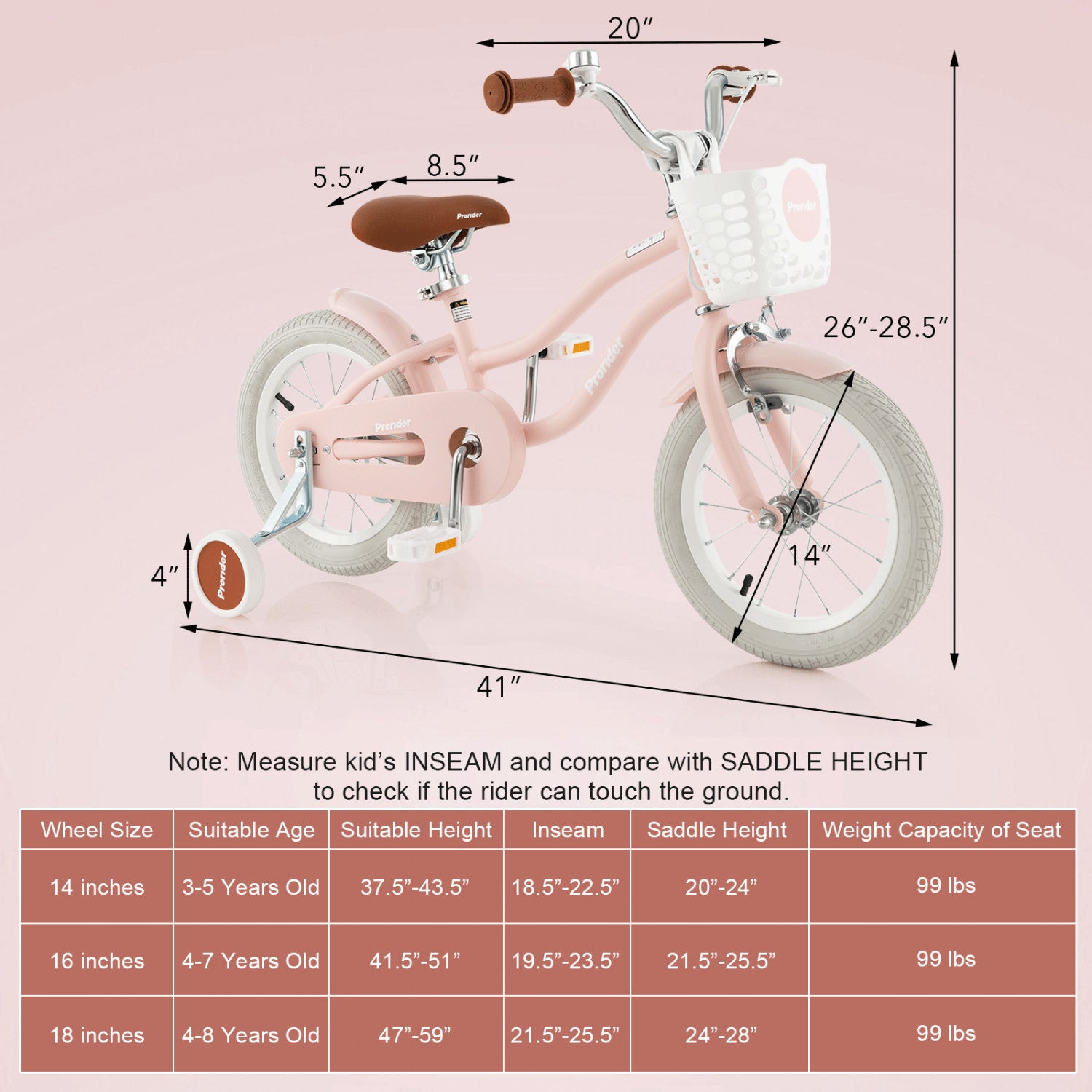 Costway 14" Kid's Bike With Removable Training Wheels & Basket For 3-5 Years Old Pink