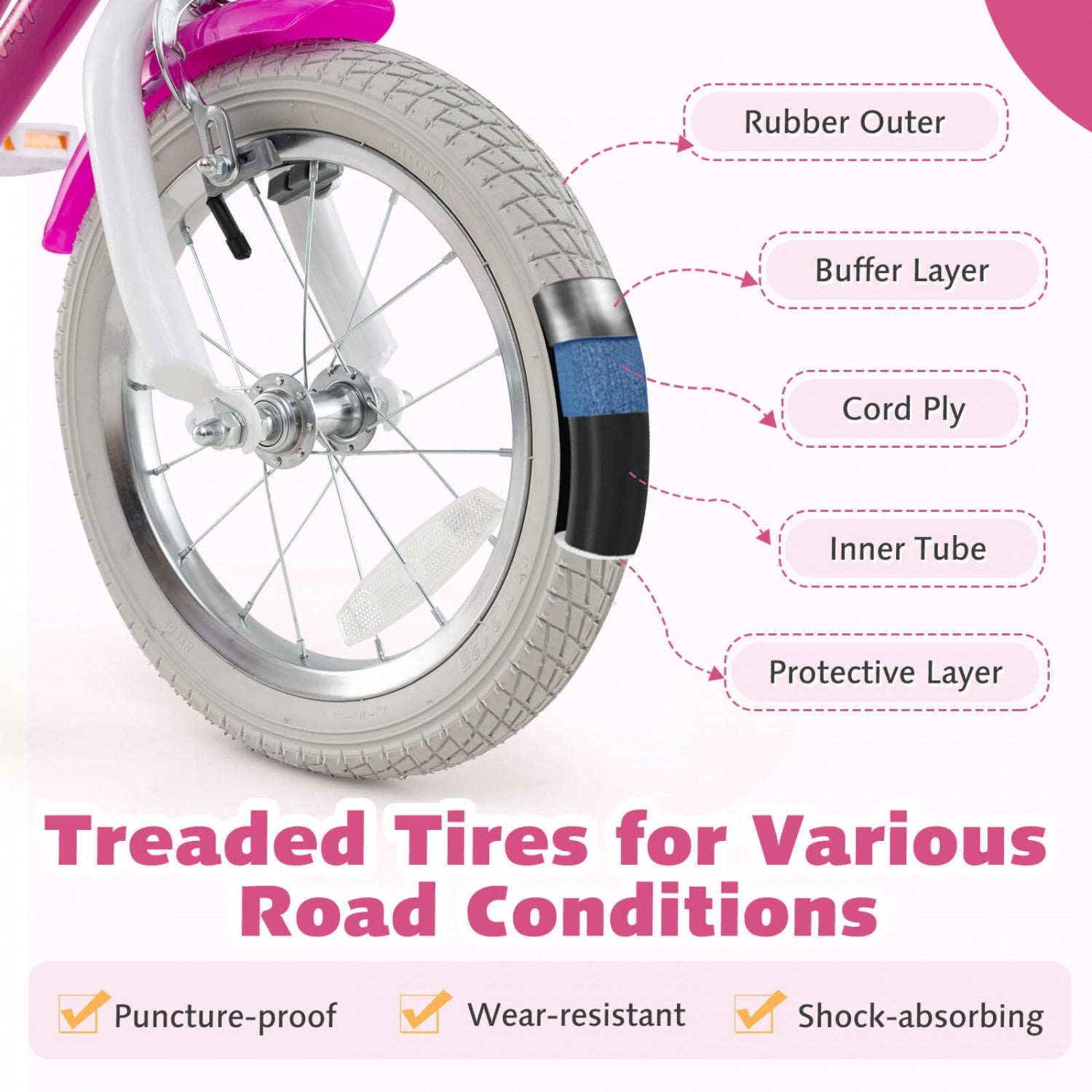 Costway 14" Kids Bike With Training Wheels Doll Seat Basket Streamers Hand Brake Pink