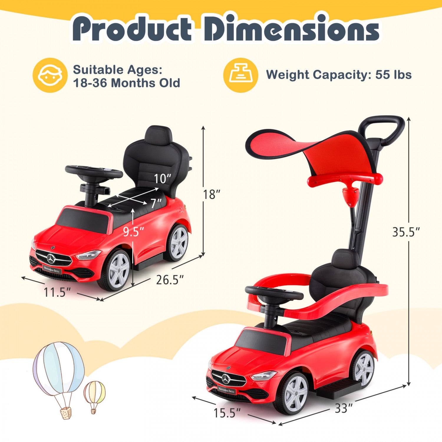 Costway Kids Ride On Push Car Mercedes-benz Licensed 3-in-1 Sliding Car Red