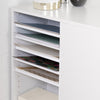 The best craft table for artists. No more working on your creations in the kitchen! This craft table gives you a dedicated space for your favorite hobby… and it’s certainly not lacking for storage! You get 6 open spaces to keep things like books, notebooks, the magazines you use for inspiration, etc. Within easy reach. We even added 5 adjustable shelves on one side, made especially for organizing 12” x 12” paper. Finally, you can keep materials like hot glue, scissors, or fabric out of sight in either of the 2 drawers: the small one in the middle or the deep large one facing front, which has a sliding shelf for easy access. A versatile craft table