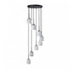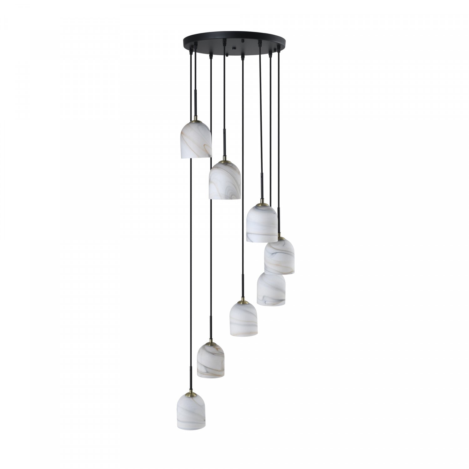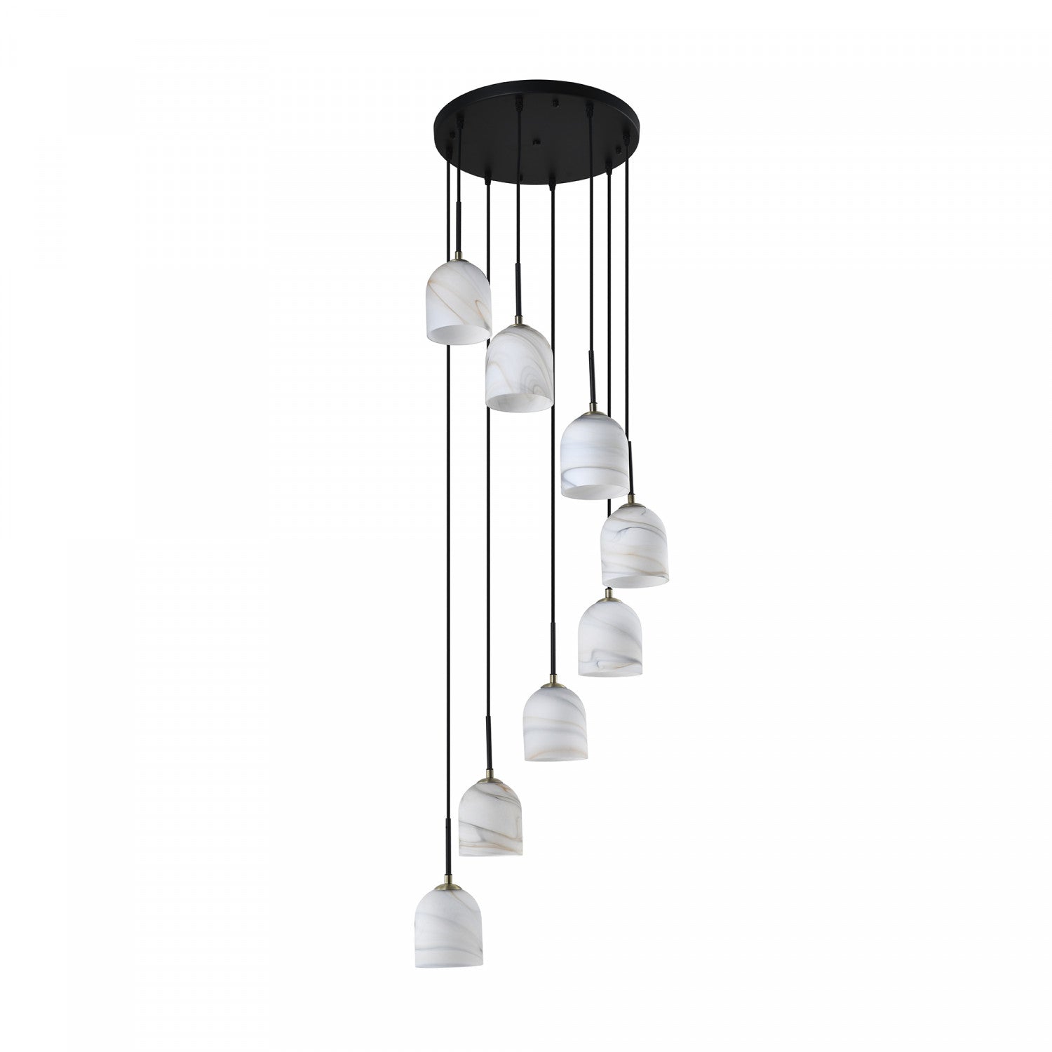 The crema collection 8 light entry foyer chandelier by steven sabados of s&c radiates understated sophistication with its alabaster-style swirl glass, casting a warm, inviting glow. Its sleek black frame is beautifully complemented by brushed brass accents, creating a perfect harmony of modern sophistication and classic charm. Rods included for easy height adjustment to suit different height requirements.