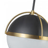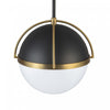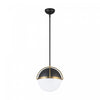 This pendant from the dahlia collection by designer kevin kraemer radiates refined sophistication with its semi-matte black frame adorned by brushed brass accents. The striking white half-sphere glass diffuser casts a warm, inviting glow. Versatile in its charm, it can be styled as a pendant or a semi-flushmount fixture. (comes with extra rods for different height preferences; also included is a hang-straight device to adapt to sloped ceilings if needed)
