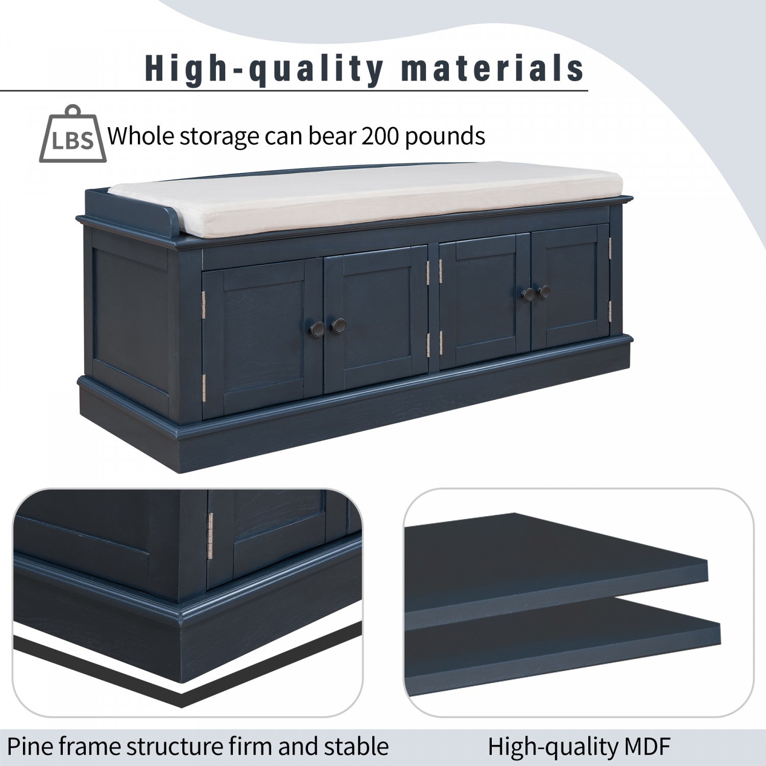 Organize your entryway with the storage bench. Featuring four doors with adjustable interior shelves, this bench combines style and practicality. A removable 2. 2-inch cushion offers added comfort, while the solid wood and mdf construction ensures lasting durability. Round handles and magnetic door closures provide easy access to everyday essentials. Ideal for hallways, mudrooms, or living rooms, this bench helps keep your home tidy and stylish. Easy to assemble with all tools included.