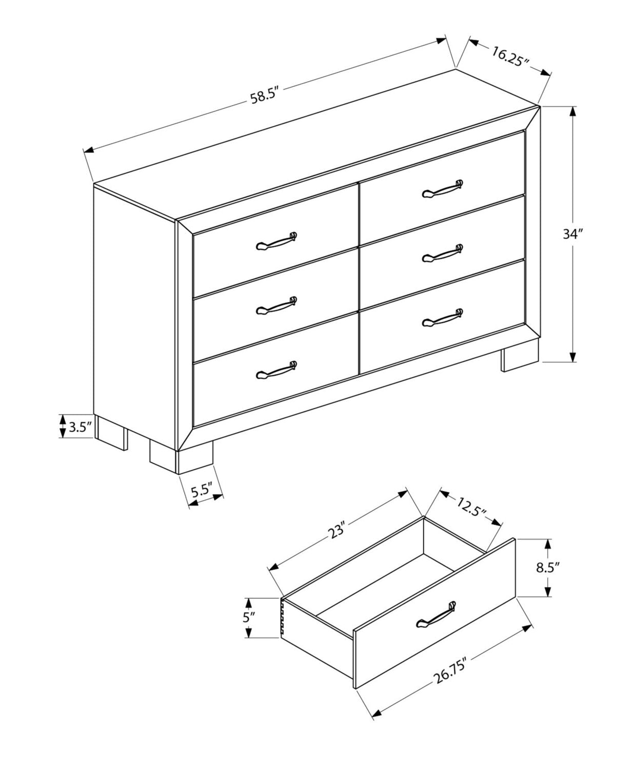 Width: 58.5" (148.6 cm) Height: 34" (86.4 cm) Depth: 16.25" (41.3 cm)