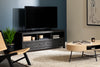 Equally suitable for use as a stand to place your television on, or as an attractive and functional piece of furniture to store your media devices if your TV hangs on the wall, the Exhibit TV Stand will enhance any living room. Clean, simple lines and decorative metal handles make this an attractive storage solution which will keep your home media area tidy and organized while complementing any home décor. The Exhibit TV Stand is the perfect surface to place LCD or plasma TVs up to 60” wide.The TV stand features 2 spacious drawers with smooth metal slides, and 3 wide and open compartments which have been carefully designed to provide adequate ventilation for electronic devices. An opening in the back panel is ideal for easy and convenient wire and power bar management – no more trailing cables!