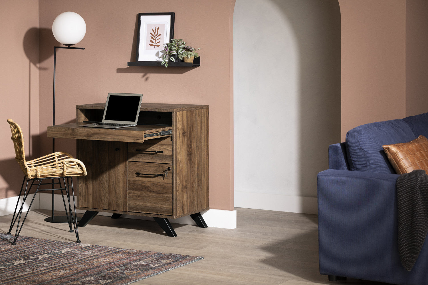 Here’s a true multi-use piece that’s sure to please those who sometimes work from home. It looks like a typical dresser at first glance, but it converts into a working desk once you deploy the sliding leaf in the center. You can use it as a work surface and put your laptop, some pencils, and a notebook on it. Since the space above is open, you don’t have to remove whatever you put there. We even added a rim on the back, and the sliding leaf locks in place: there’s no risk of it constantly shifting while you work or of your things falling when you slide it back in. This desk is a real “chameleon” piece of furniture, which makes it ideal for the living room, bedroom, or basement. Organize books, notebooks, binders, and whatever else you might need in the top drawer or the cabinet (behind the door), which has two storage spaces divided by an adjustable shelf. The file drawer at the bottom (size 8½”x11” or 8½”x14”) will help you organize your papers so you can easily find your important documents and contracts. Another plus: it can be locked with a key, for better security. We love the natural and clean aspect of the Scandinavian style. This small desk, with its minimalist lines, delicate handles, and solid angled legs, will enhance your decor while giving it a more original look!