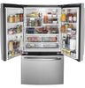 Upgrade your groceries and condiments to a spacious new home in this 27-cubic-foot capacity GE French-door refrigerator. With six door bins, a full pantry door and two humidity controlled crispers, this mammoth refrigerator can cool your largest grocery runs while keeping everything organised and tidy. Four spill-proof shelves ensure that even when things get messy, cleanup is contained and easy, and a fingerprint-resistant stainless steel finish is effortlessly wiped clean to stay shining like new.
