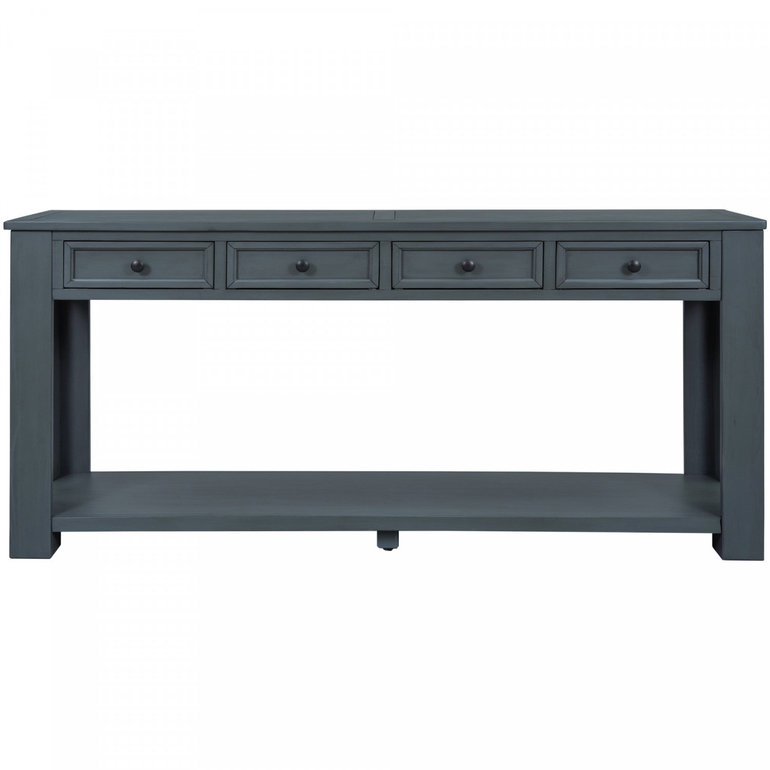 The console table offers generous storage and timeless style for your entryway, hallway, or living room. Crafted from solid wood and mdf, this 63-inch-wide table includes four drawers and a wide lower shelf to keep your essentials organized. A durable frame and distressed espresso finish enhance its rustic charm, while straight legs and clean lines lend a refined, high-end look. Whether placed behind a sofa or in a foyer, it adds both function and elegance. Simple assembly with all tools included.