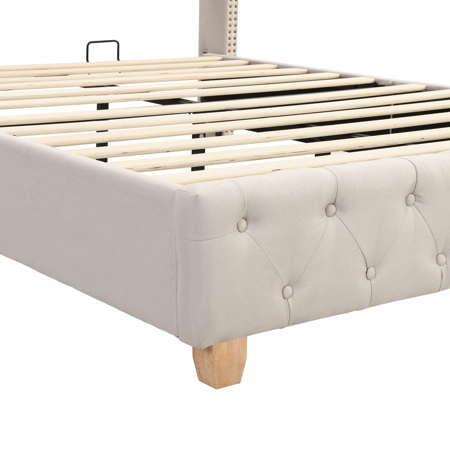 The linen upholstered platform bed combines timeless style and comfort with its classic wingback headboard, diamond tufted upholstery, and luxurious gold nailhead trim. The plush linen headboard provides ample support for lounging and reading, while the sturdy wooden legs offer a solid foundation for durability. Perfect for any bedroom, this bed merges elegance with functionality, creating a cozy and sophisticated sleep space.
