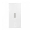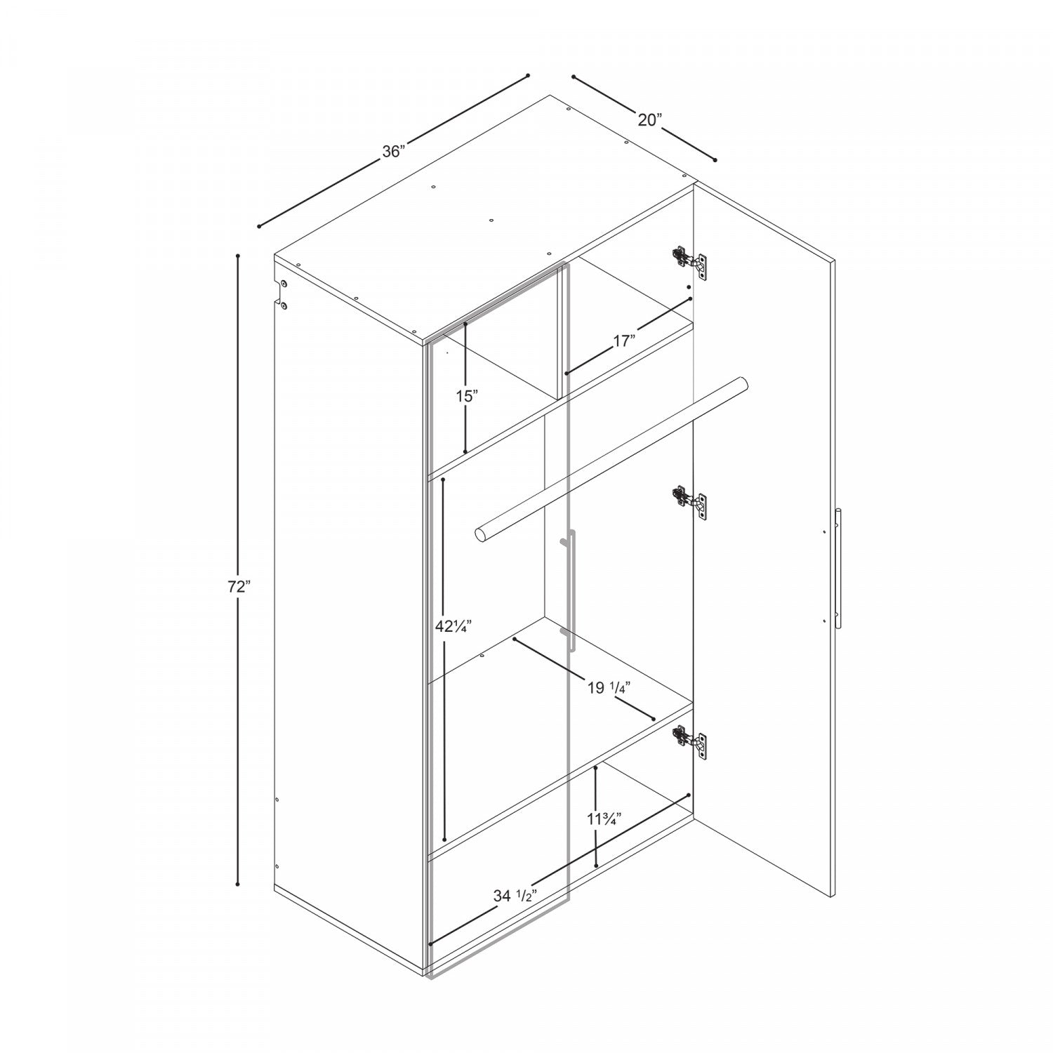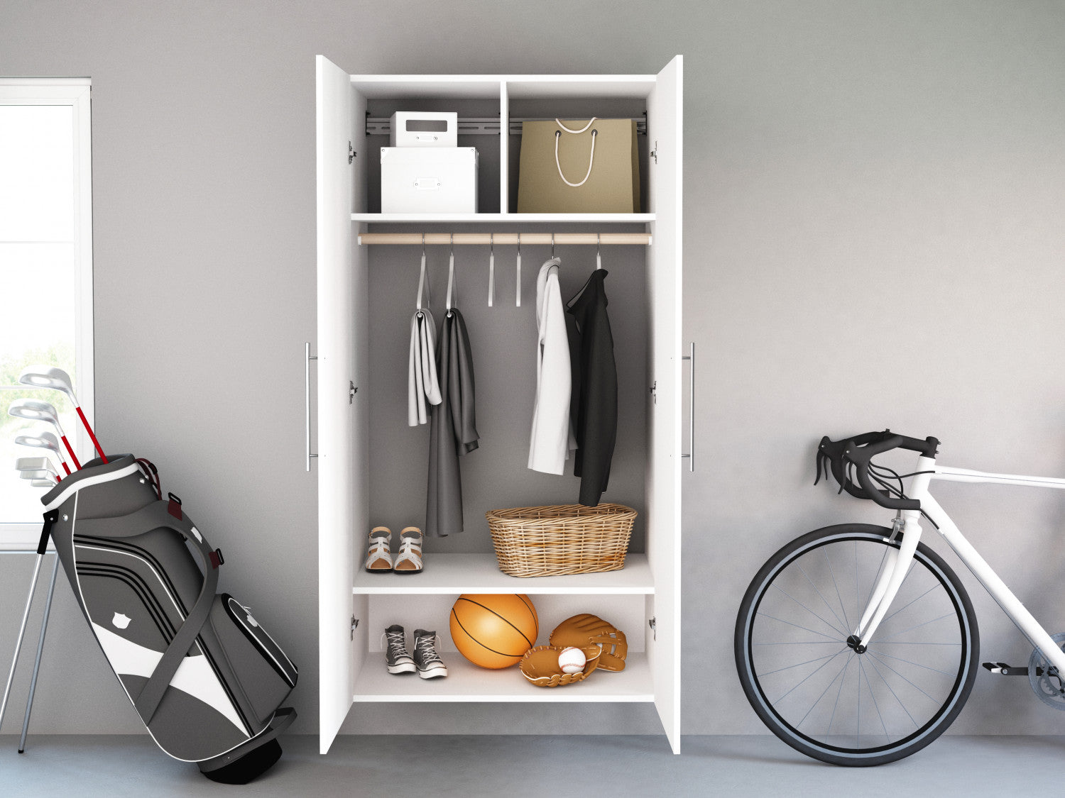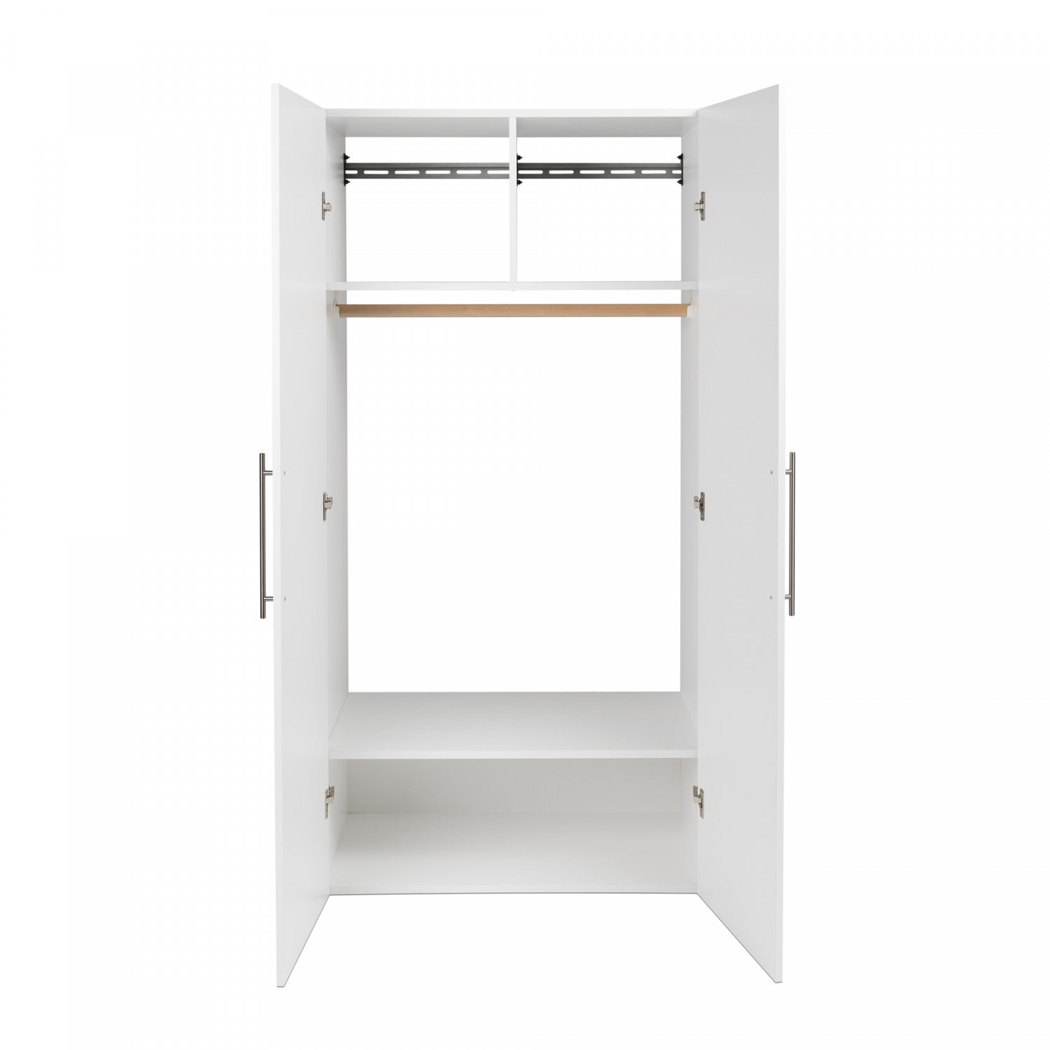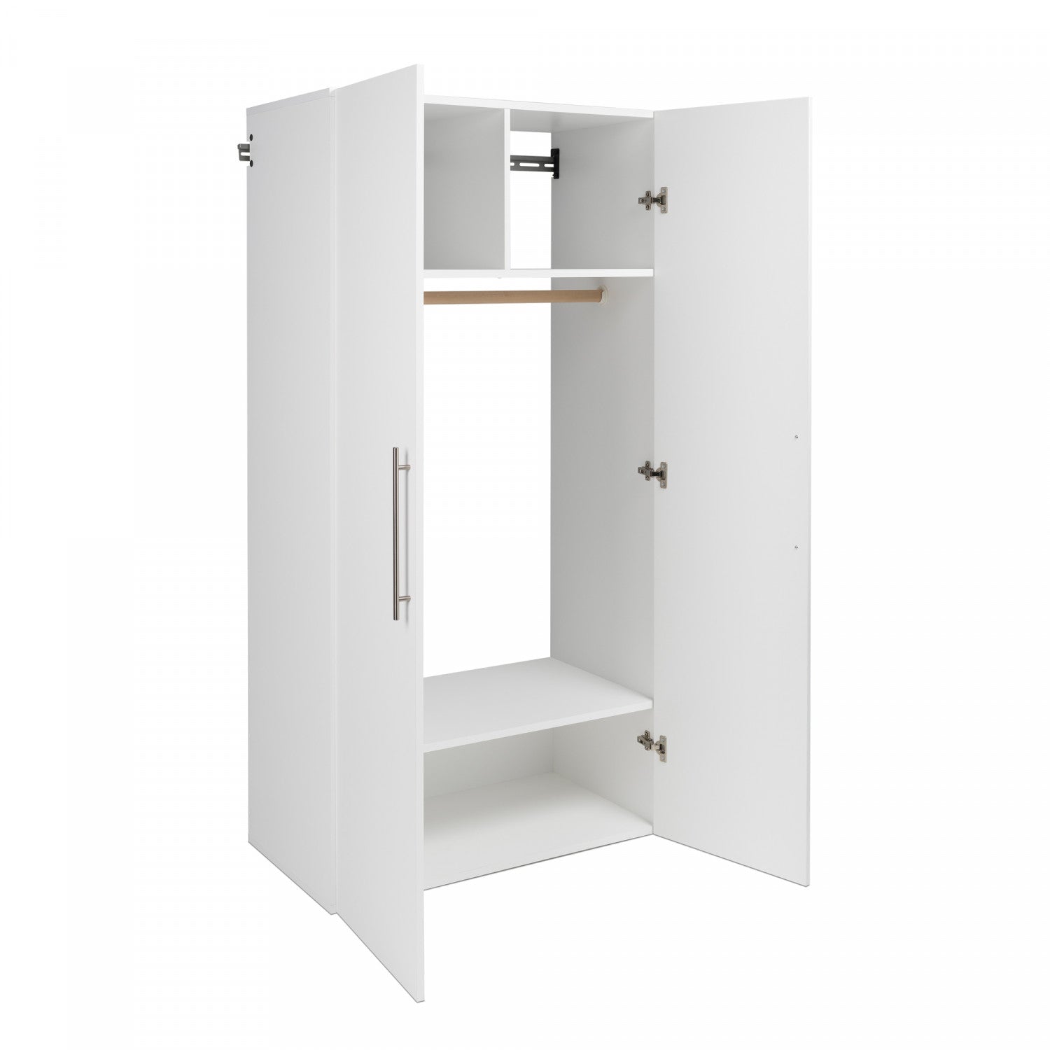 Welcome in a new organizational system with the prepac hang-ups wardrobe cabinet. This wall-mounted storage solution features two sophisticated clean line doors on adjustable hinges, one top fixed shelf with a middle divider, one bottom fixed shelf and an integrated wooden hanging rod for flexibility. In a fresh white laminate finish with two satin nickel-finished metal pull handles, this multipurpose wardrobe cabinet blends right into your home. Use this spacious wardrobe compartment to hang your jackets from the wide rod, and slide your accessories into the fixed shelves. This wardrobe cabinet is the perfect extension to your bedroom closet system, or as a coat closet in your mudroom, entryway, or garage. Designed to be secured into a sturdy wall with the included heavy duty metal rail and hook system, your stowed items will be kept safe from debris while allowing for easy clean-upon the ground or other surfaces underneath. This durable cabinet ships flat packed and ready to be assembled upon delivery with an included instructional booklet, hanging rails and fastening bolts. This unit is made with non-toxic, carb-2 compliant laminated composite woods. Measuring 20"d x 36"w x 72"h, you won't run out of storage space for your clothing.