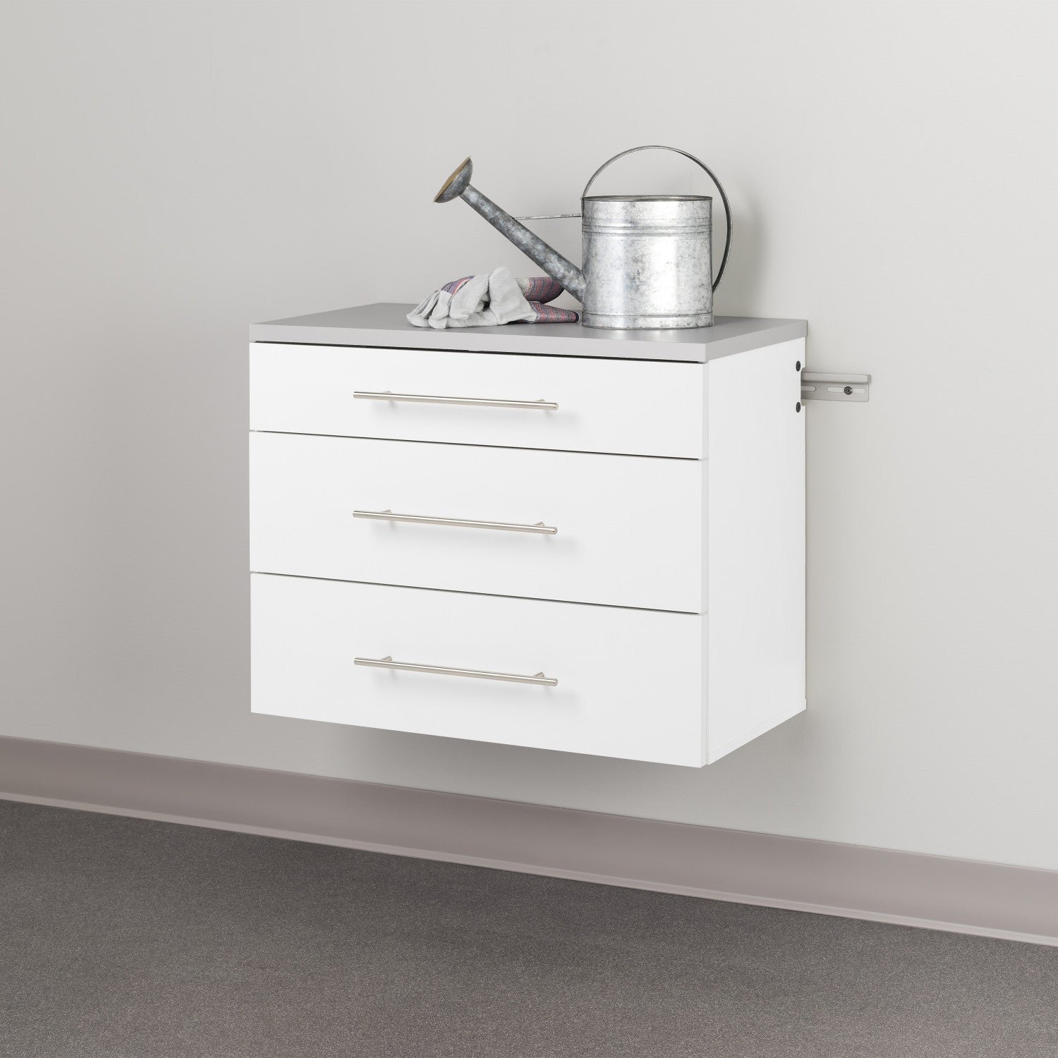 The HangUps 3 Drawer Base Cabinet offers versatility for your ever changing storage needs in the garage, laundry room, office or workshop. This cabinet is constructed using laminated composite wood and features 3 sturdy drawers with 1/2 in. drawer bottoms and metal drawer sides. The Base Cabinet mounts securely to the wall with a heavy duty metal rail and hook system. The wall mounted feature ensures easy cleaning beneath the cabinets and protects your stored items from water and dirt. This product ships ready-to-assemble and includes all hanging rails and fastening bolts. Add other cabinets from our HangUps Collection to create a storage system to convert any cluttered room into an organized space.