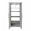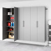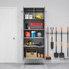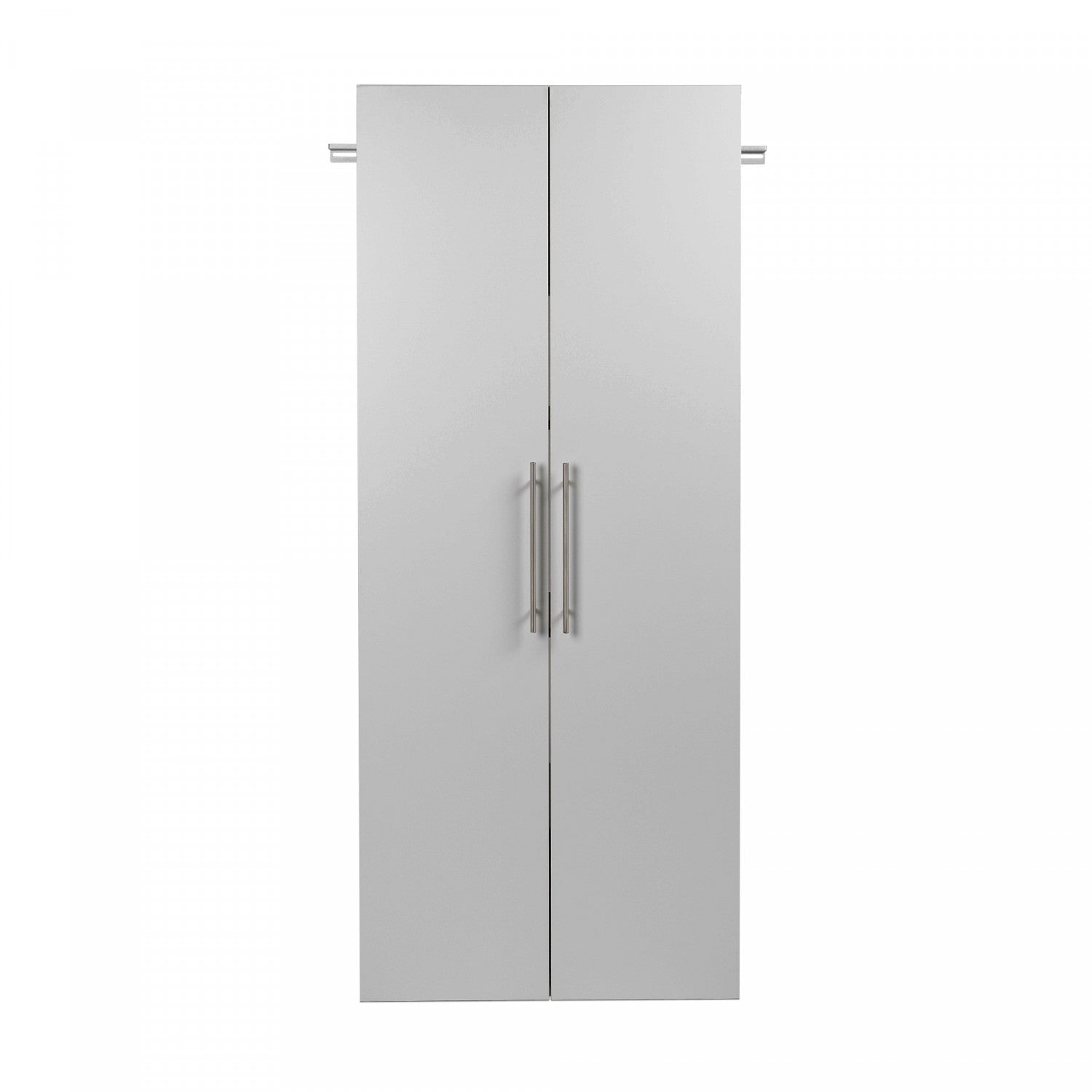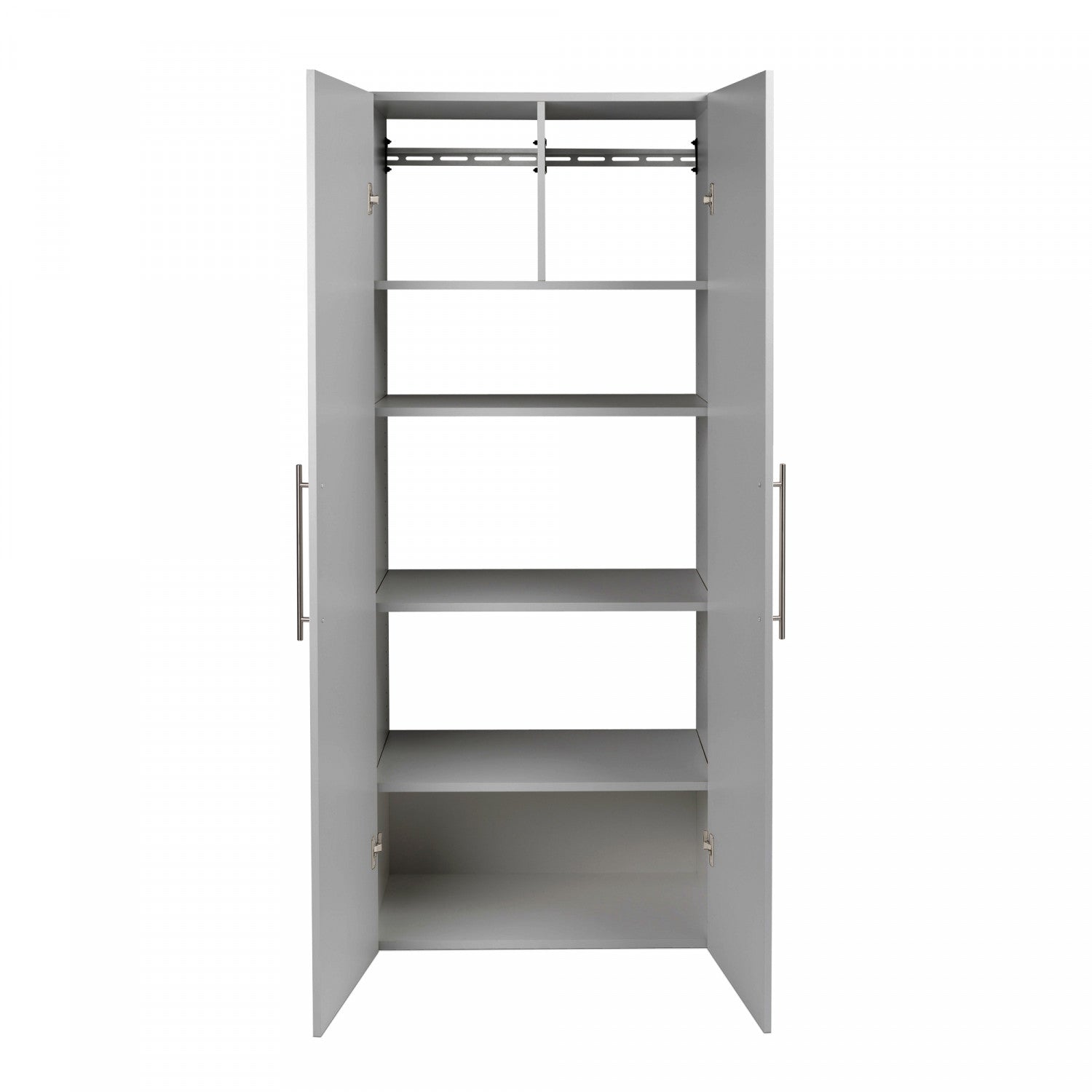 Welcome in a new organizational system with the prepac hang-ups large storage cabinet. This wall-mounted cabinet features two sophisticated clean line doors on adjustable hinges, three adjustable shelves and one fixed shelf with a middle divider, offering flexibility to fit to your ever-changing storage needs. Adorned with a light gray laminate finish and two satin nickel-finished metal pull handles, this multi-use utility cabinet will provide subtle storage anywhere. Designed to be secured into the wall in your garage, laundry room, basement, workshop, or office with the included heavy duty metal rail and hook system, your stowed items will be kept safe from debris and the ground will be easier to clean. The large internal capacity grants a repository for your tools, linens, gardening equipment, documents, clothing, and more while keeping them compartmentalized and clutter-free. This durable cabinet ships flat packed and ready to be assembled upon delivery with an included instructional booklet, hanging rails, and fastening bolts. This organizer shelf unit is made with non-toxic, carb-2 compliant laminated composite woods for durability. Measuring 16"d x 30"w x 72"h, there is no limit to what you can safely stow away. Pair this unit with other items from the hang-ups collection.