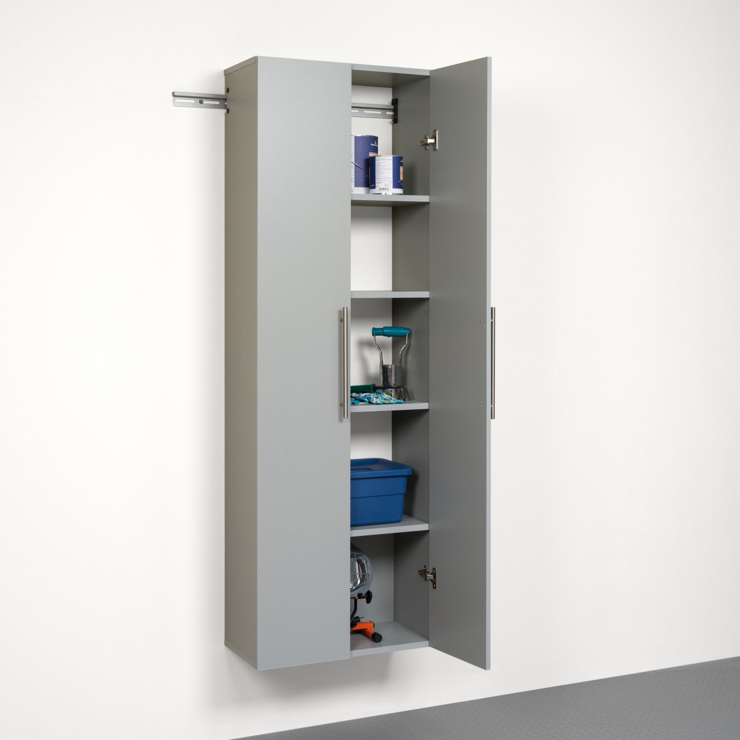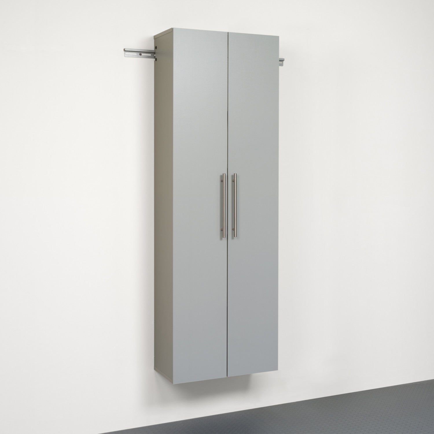 The hang-ups 24" large storage cabinet offers versatility for your ever changing storage needs in the garage, laundry room, office or workshop. This cabinet mounts securely to the wall with a heavy duty metal rail and hook system. The wall mounted feature ensures easy cleaning beneath the cabinets and protects your stored items from water & dirt. The hang-ups collection is constructed using industrial grade laminated composite wood and features metal handles and adjustable hinges. This product ships ready-to-assemble and includes all hanging rails and fastening bolts. Add other cabinets from our hang-ups collection to create a storage system to convert any cluttered room into an organized space.