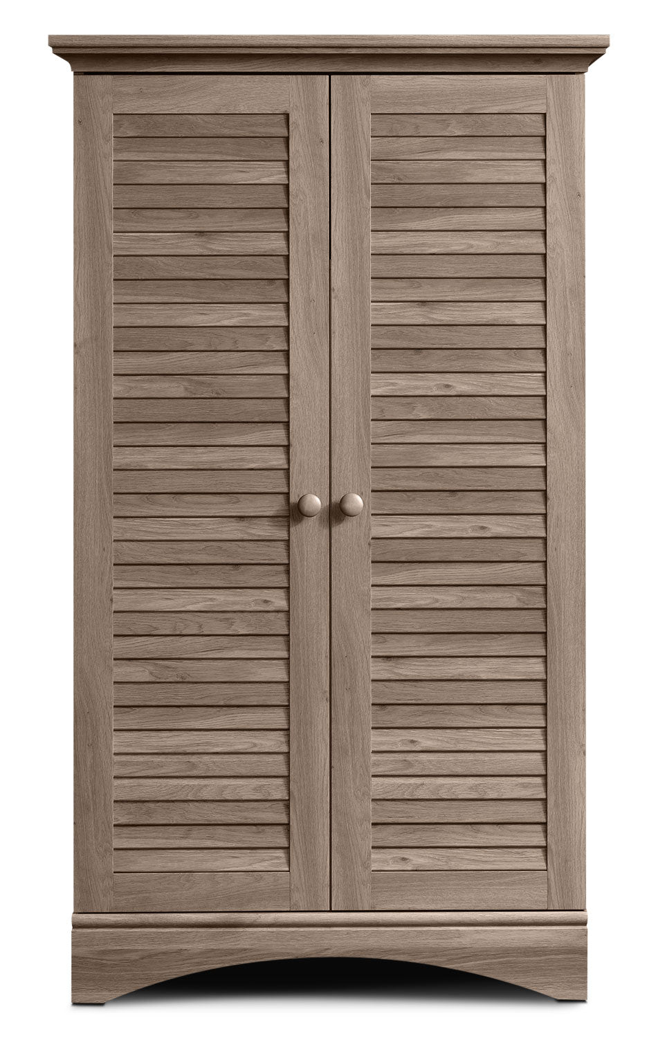 Countrified roots and contemporary flair combine in this charming Harbor View storage cabinet. Finished in a rustic salt oak, the horizontally-slatted doors and solid wood knobs radiate shaker-style simplicity with the perfect touch of splendour. This transitional cabinet complements both contemporary and traditional styles, making it easy to integrate into your decor. What's more, engineered wood overlaid with paper laminate creates a durable piece that withstands the rigours of daily use.